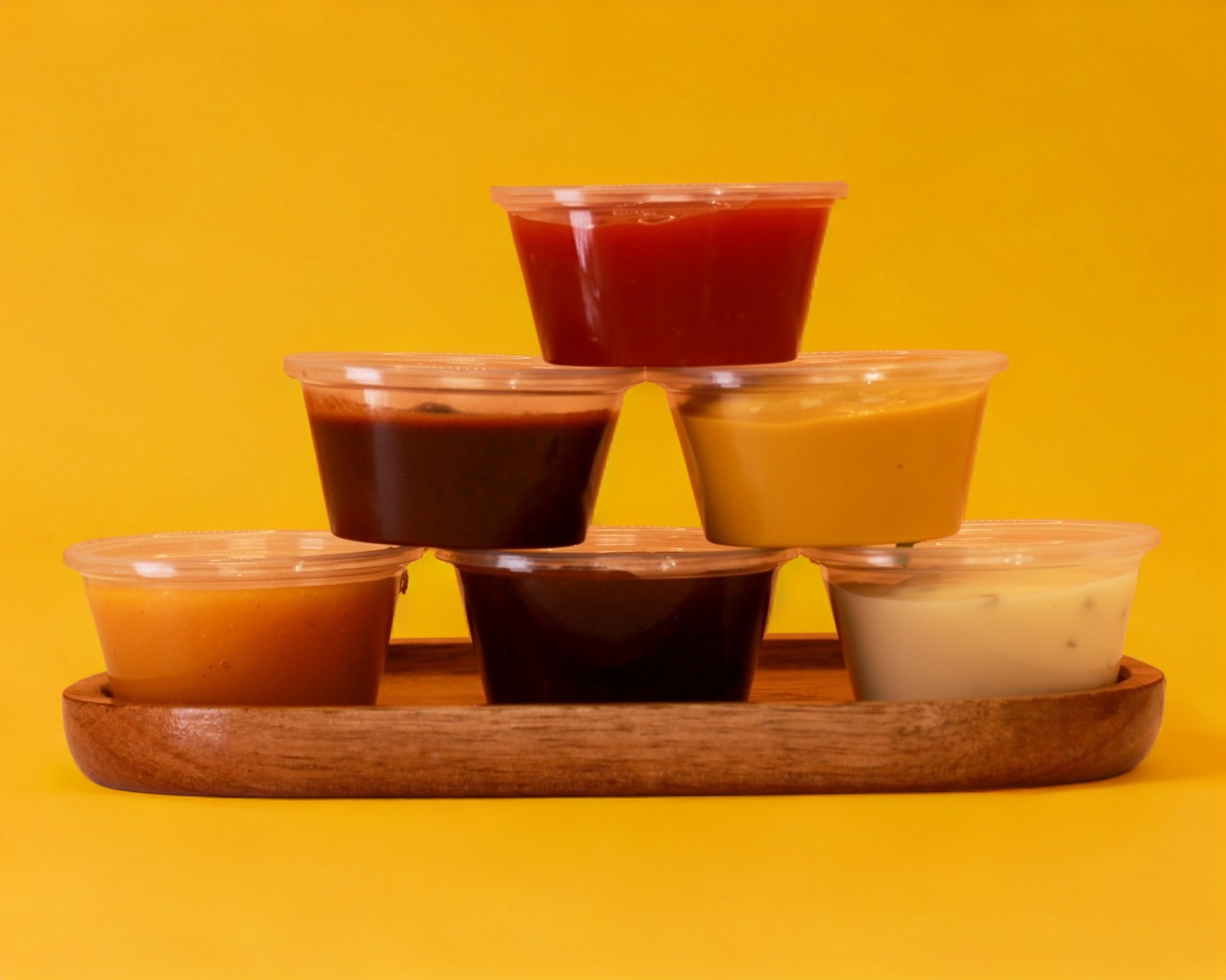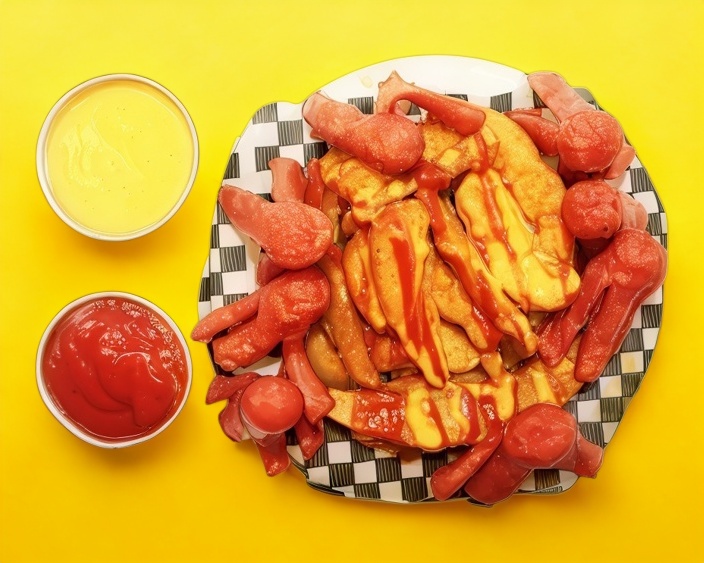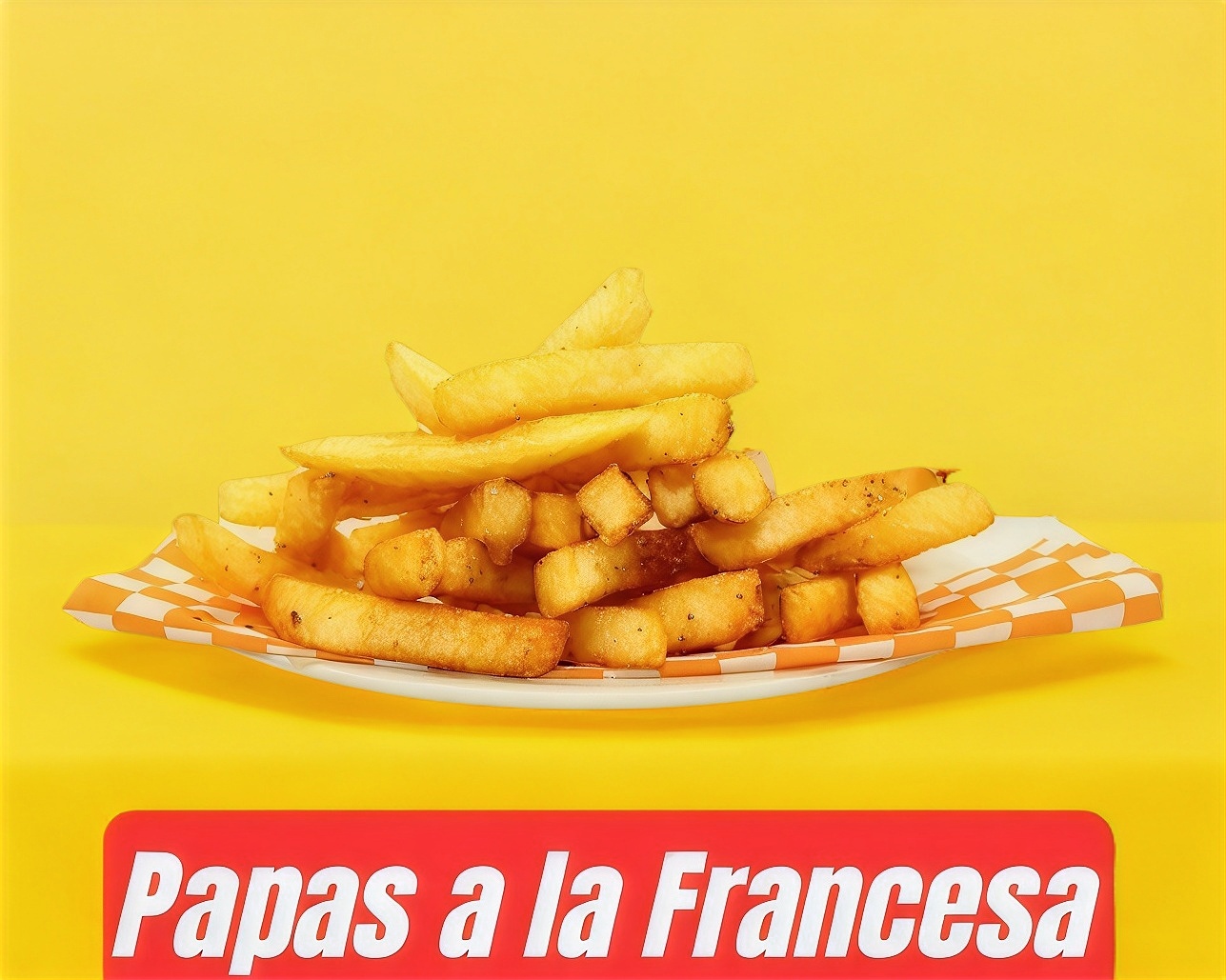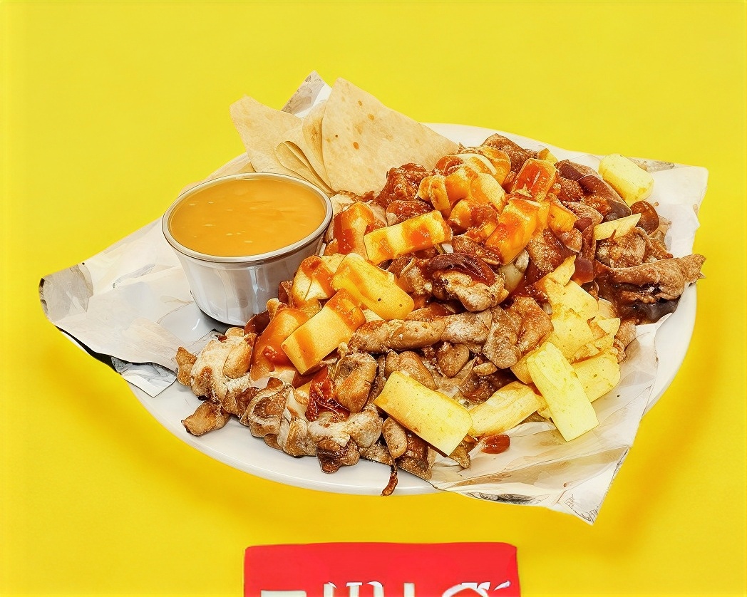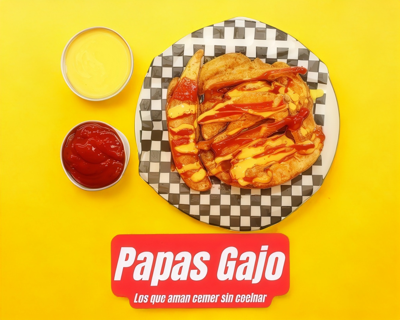 Exquisitas papas gajo marinadas al estilo New York, acompañadas con salsa capsu, queso amarillo y salsa valentina