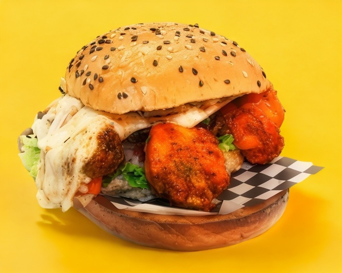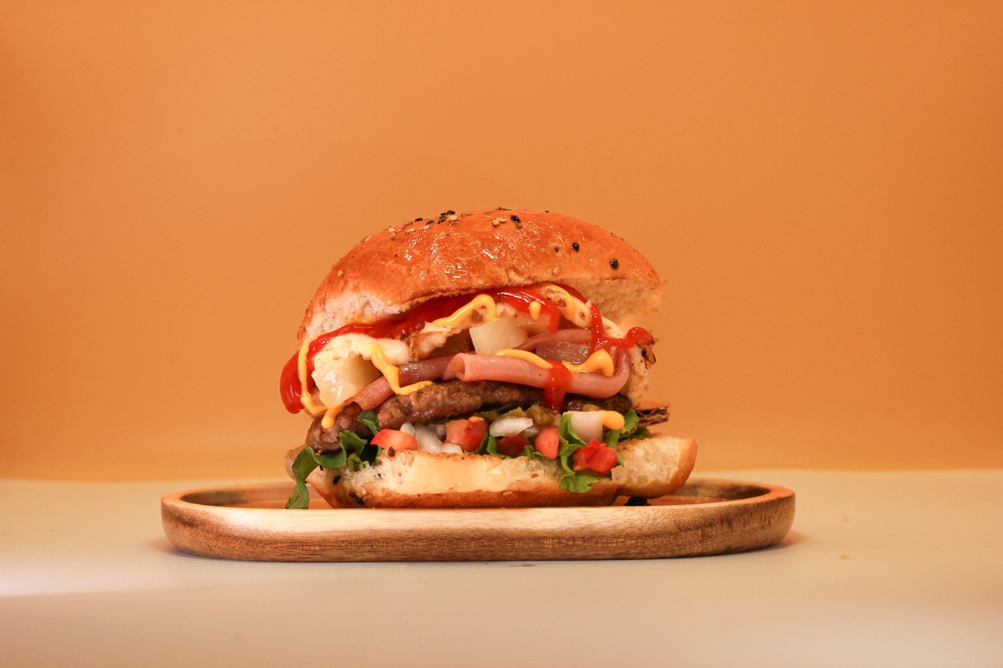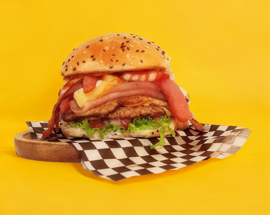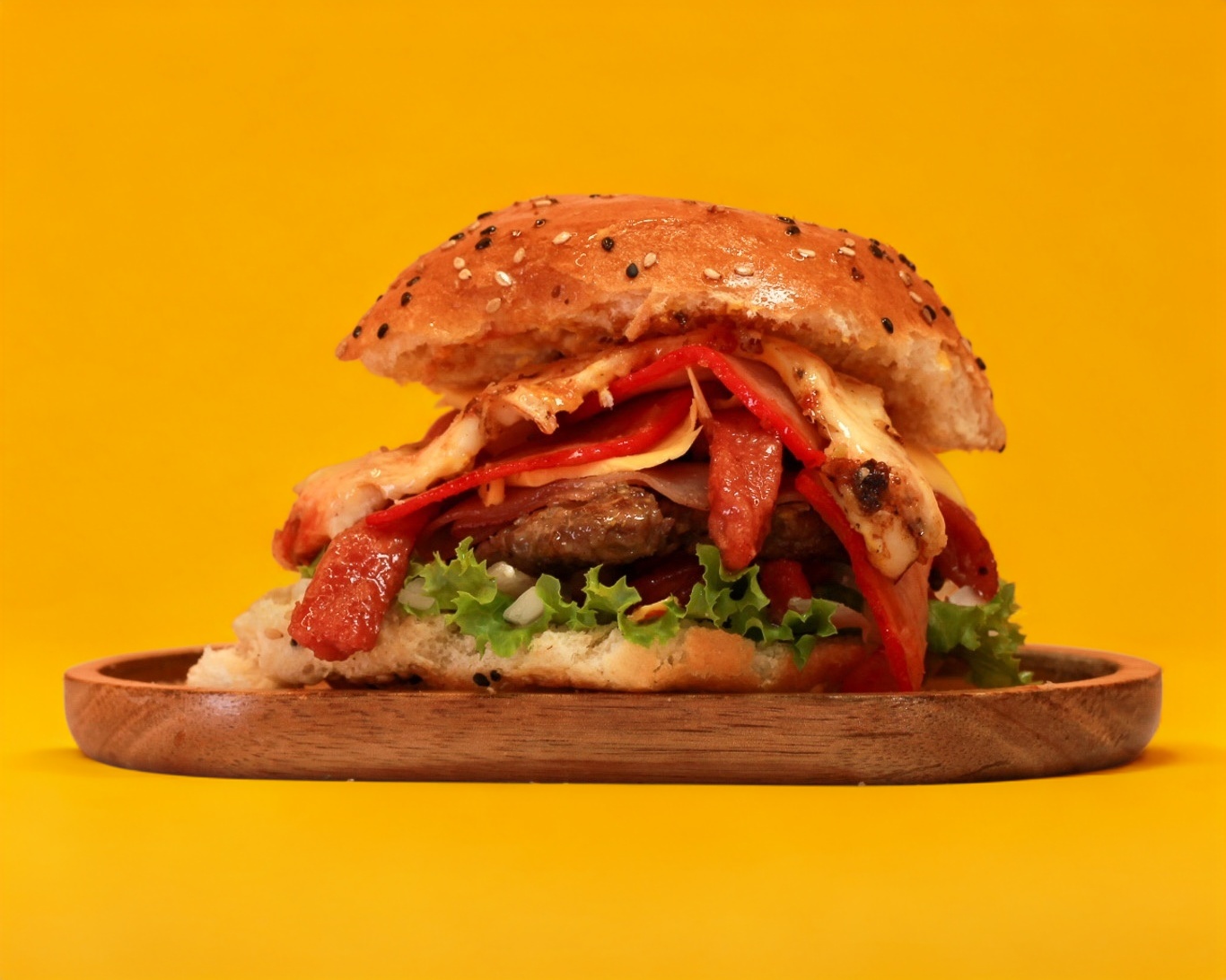 Hamburguesa estilo Taster, tocino, jamon piña y quesos