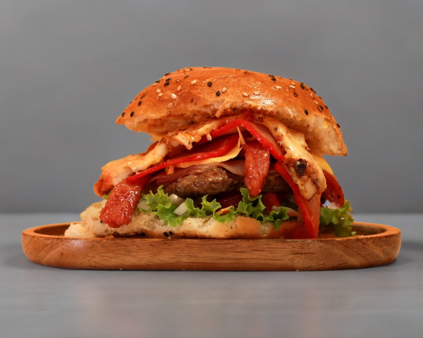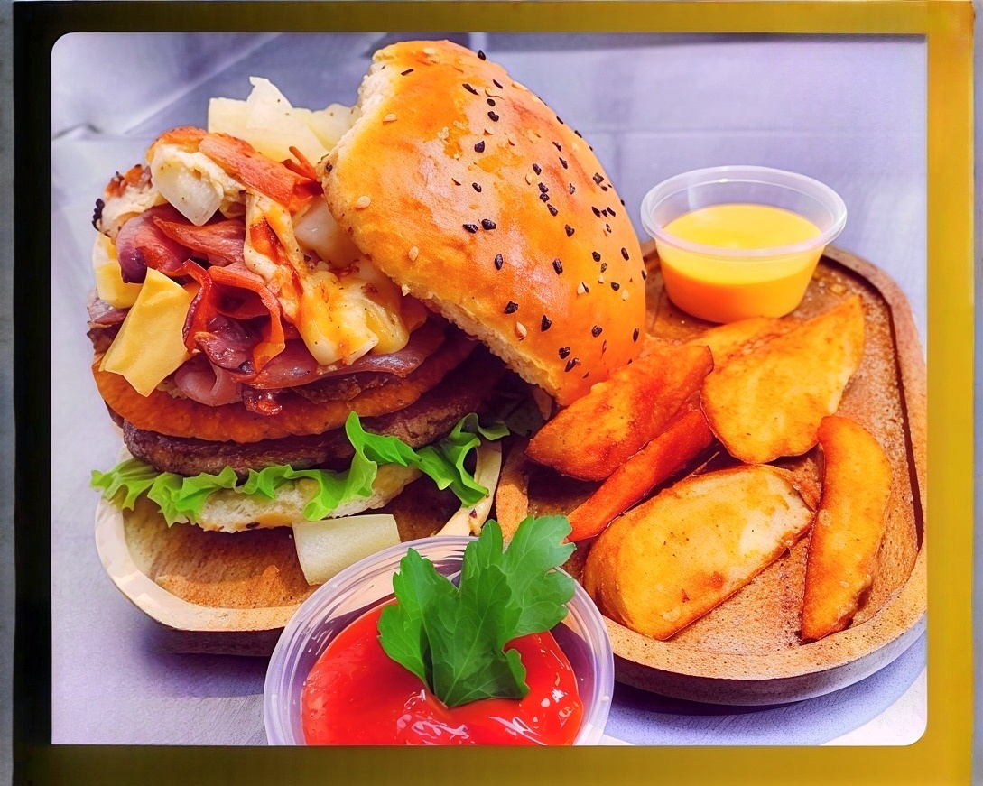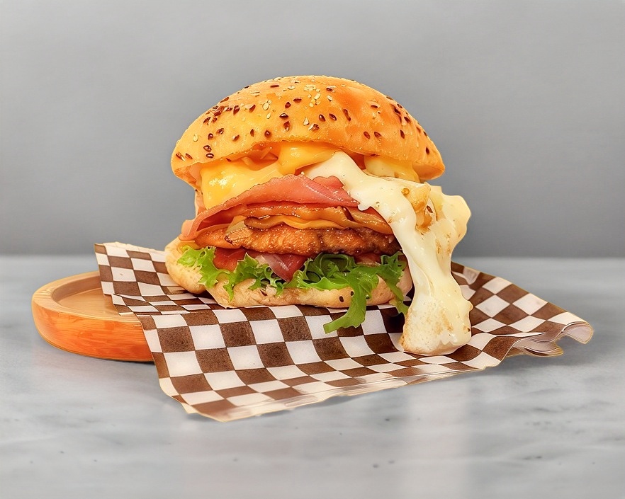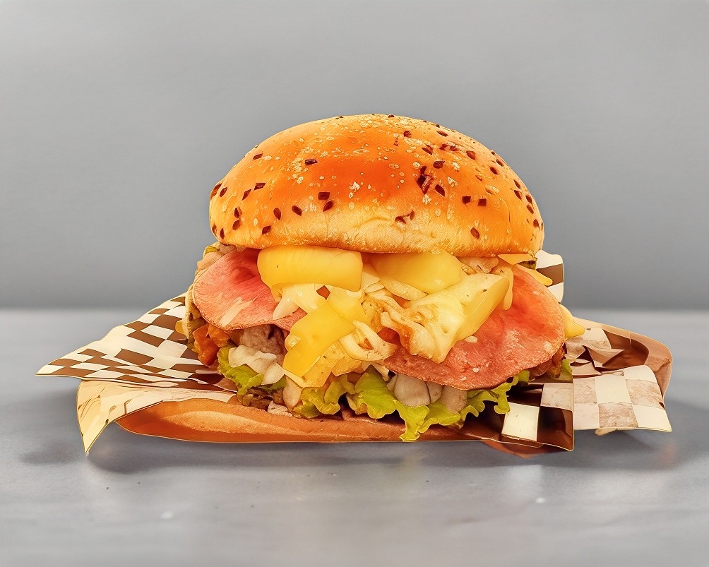 Carne de la casa (100gr), queso americano, jamón, piña y enfurción de queso.