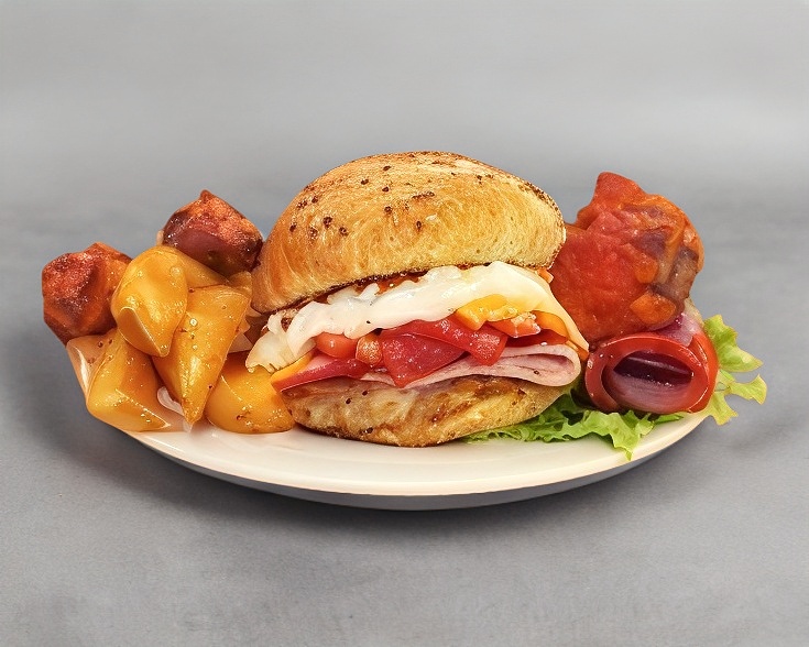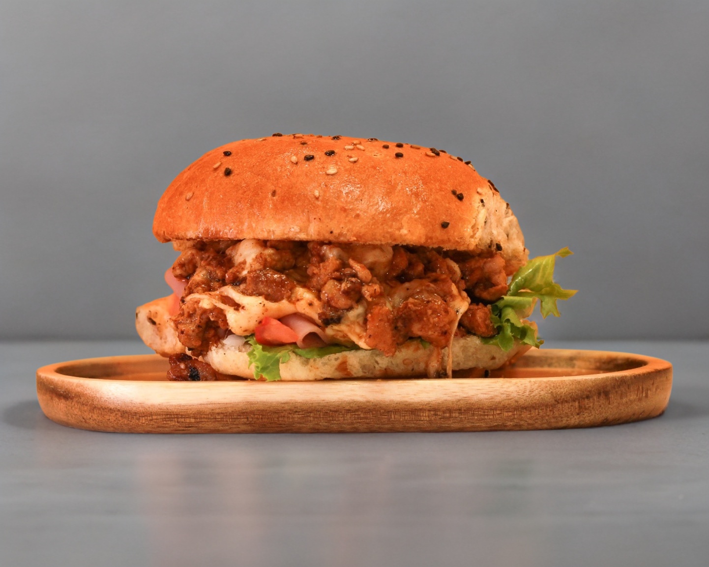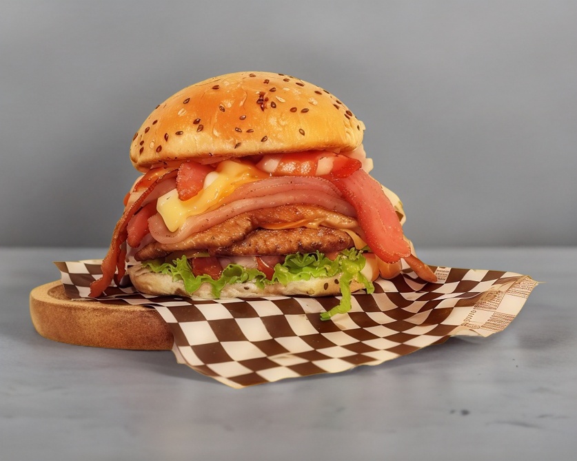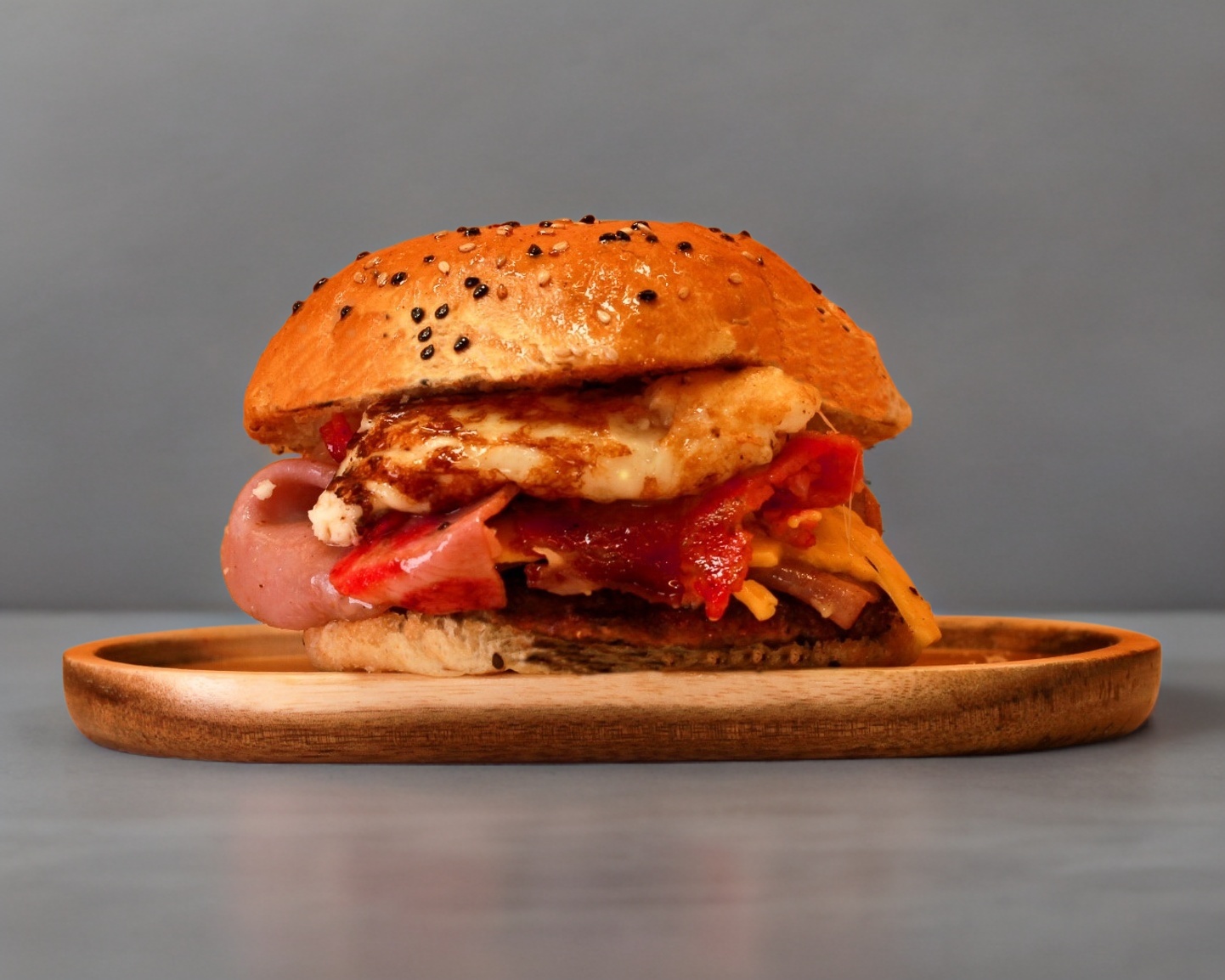 Carne de la casa (100gr), queso americano, jamón, piña y enfurción de queso.