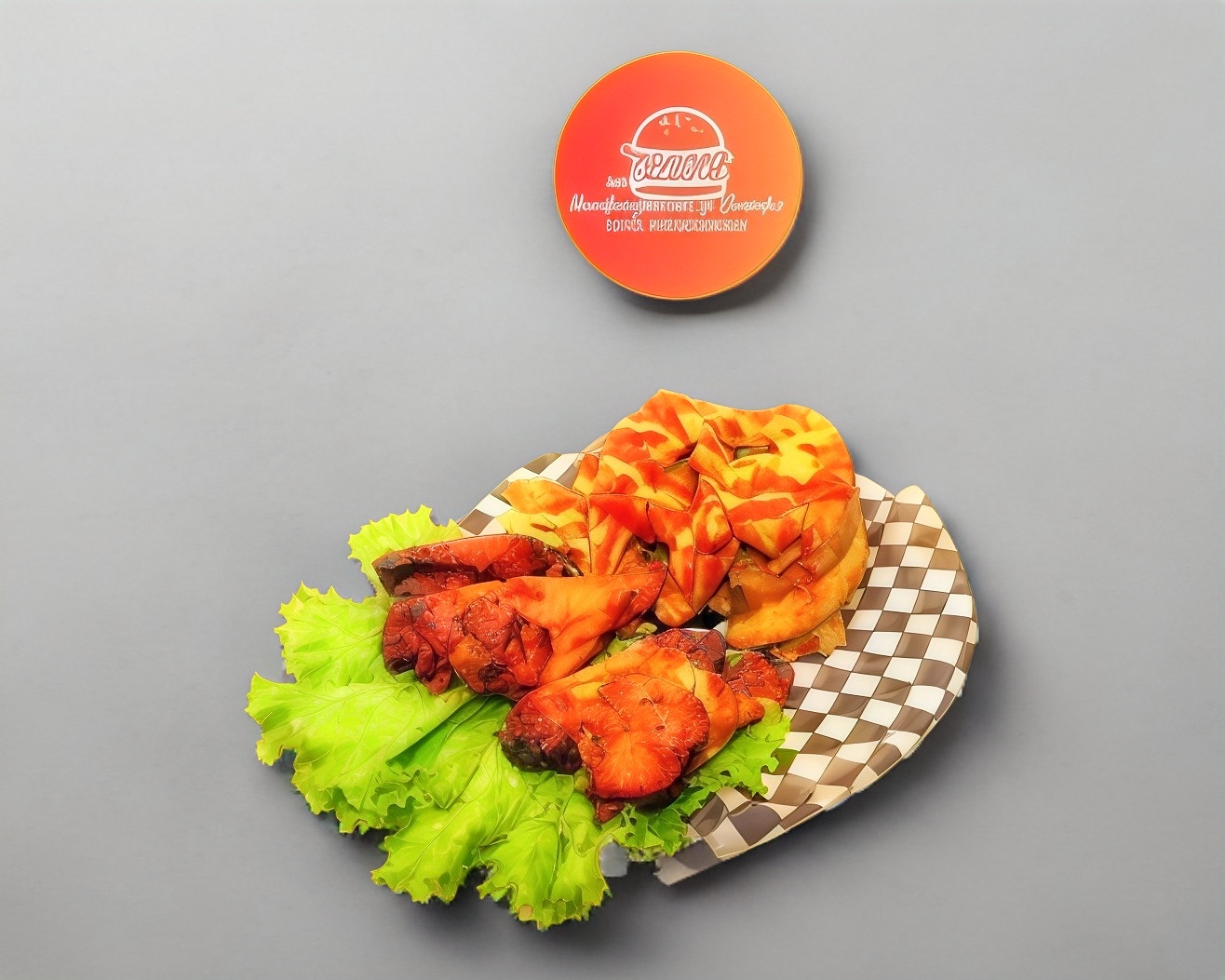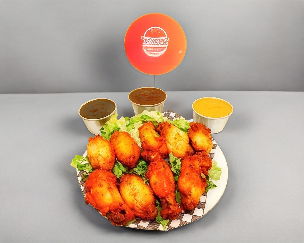 9 alitas al carbón con salsa Bbq en cama de lechuga, acompañado de julianas de pepino y aderezo