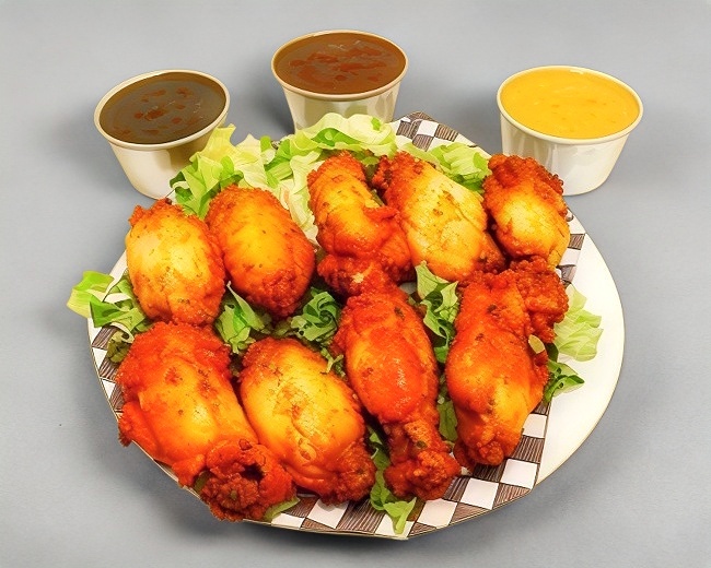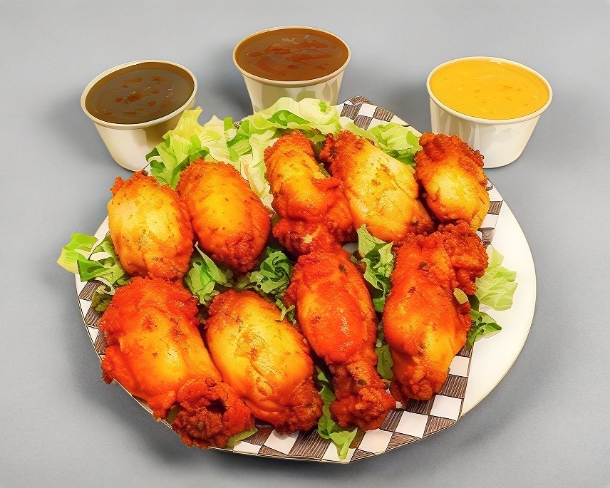 3 Piezas de pollo adobado en cama de lechuga y queso fundido, con salsa agridulce.