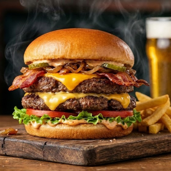 Bollo brioche con sabor de la casa, triple smash de 60 g (molida de ribeye), tocino crujiente (50 g) y mezcla de queso asadero con gouda.