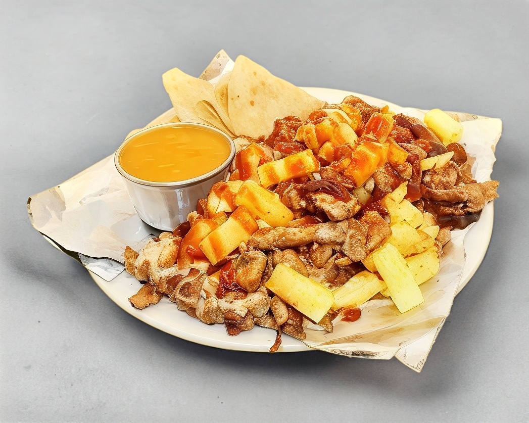 EXquisitas papas gajo marinadas al estilo New York, acompañadas con salsa capsu, queso amarillo y salsa valentina