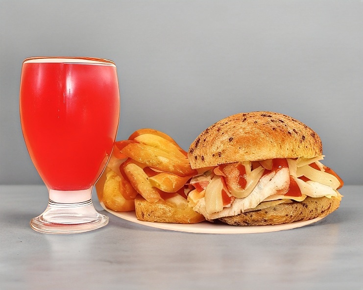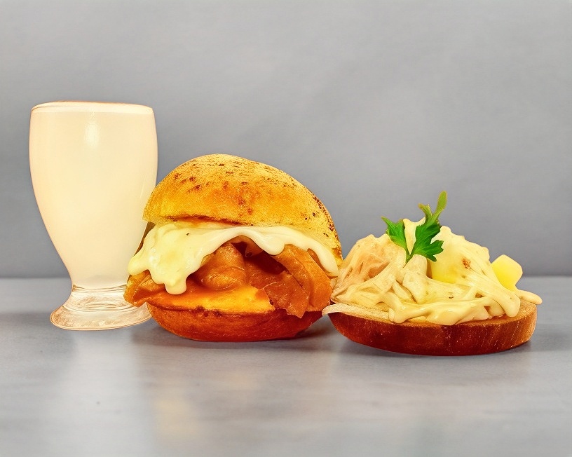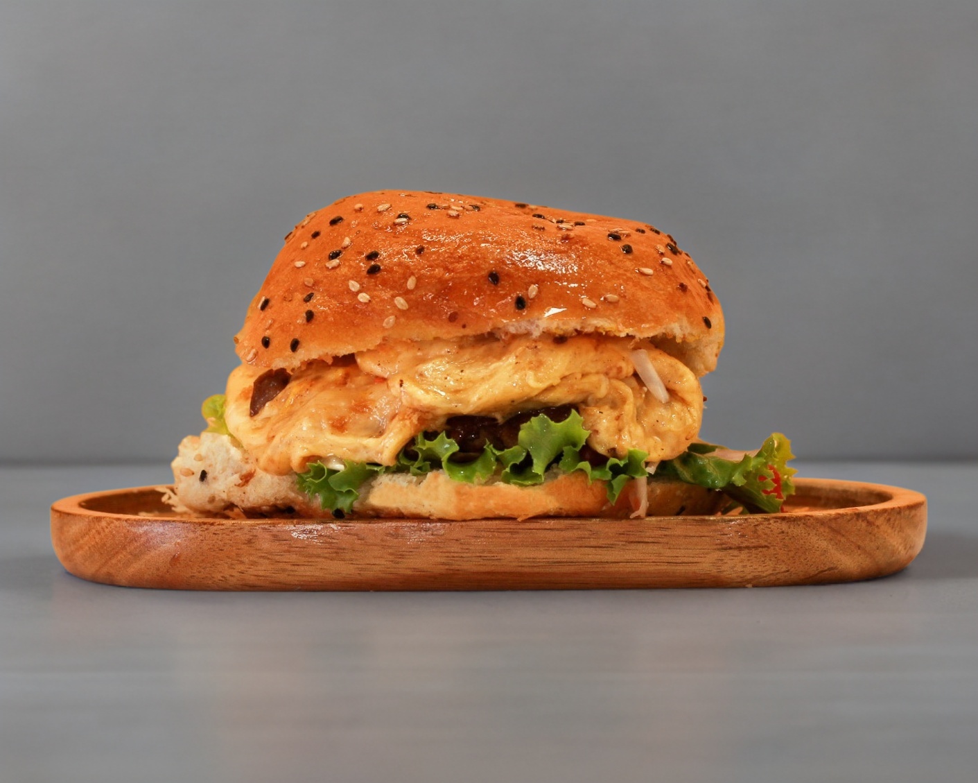 Pan brioche, Aderezos, catsup heinz, moztaza, Medallon de pollo empanizado, queso y verdura
