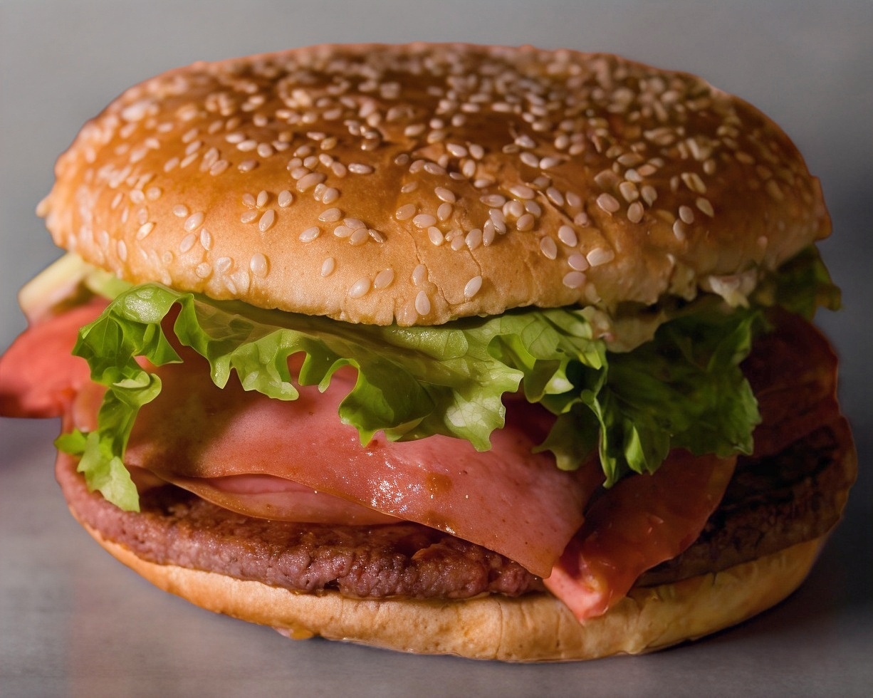 Hamburguesa estilo Taster, aguacate, tocino, jamon piña y quesos