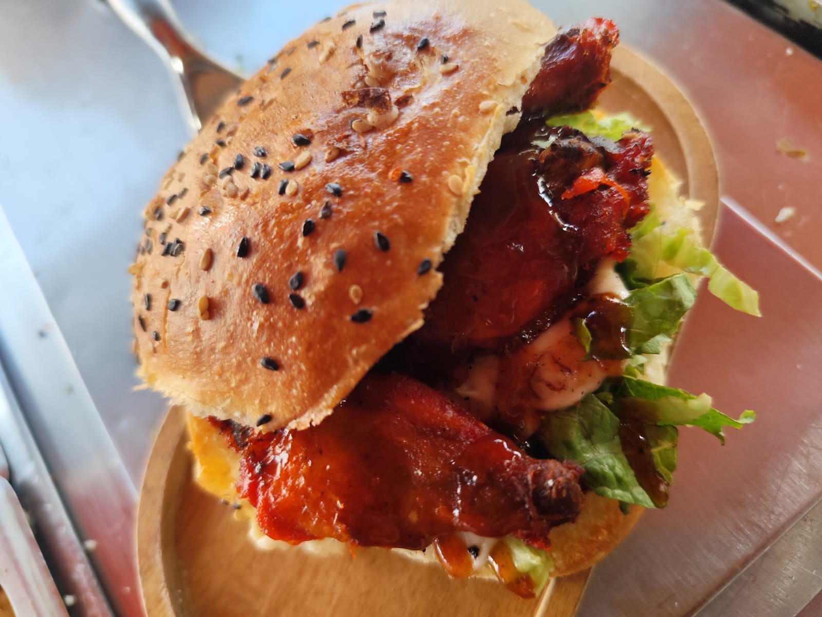 Pan artesanal con sabor a especias, con carne de arrachera sonorense, aguacate, tocino, jamón, piña y quesos.