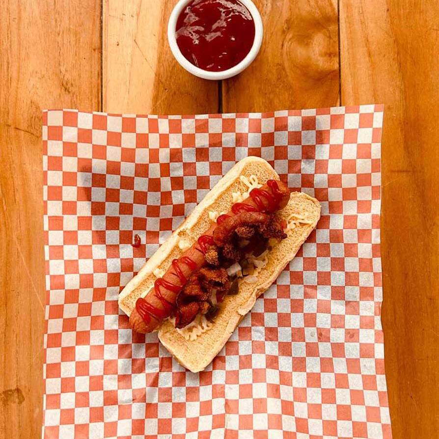 Hot Dog de 25 cm con Tocino picado, cebolla. jitomate y picante