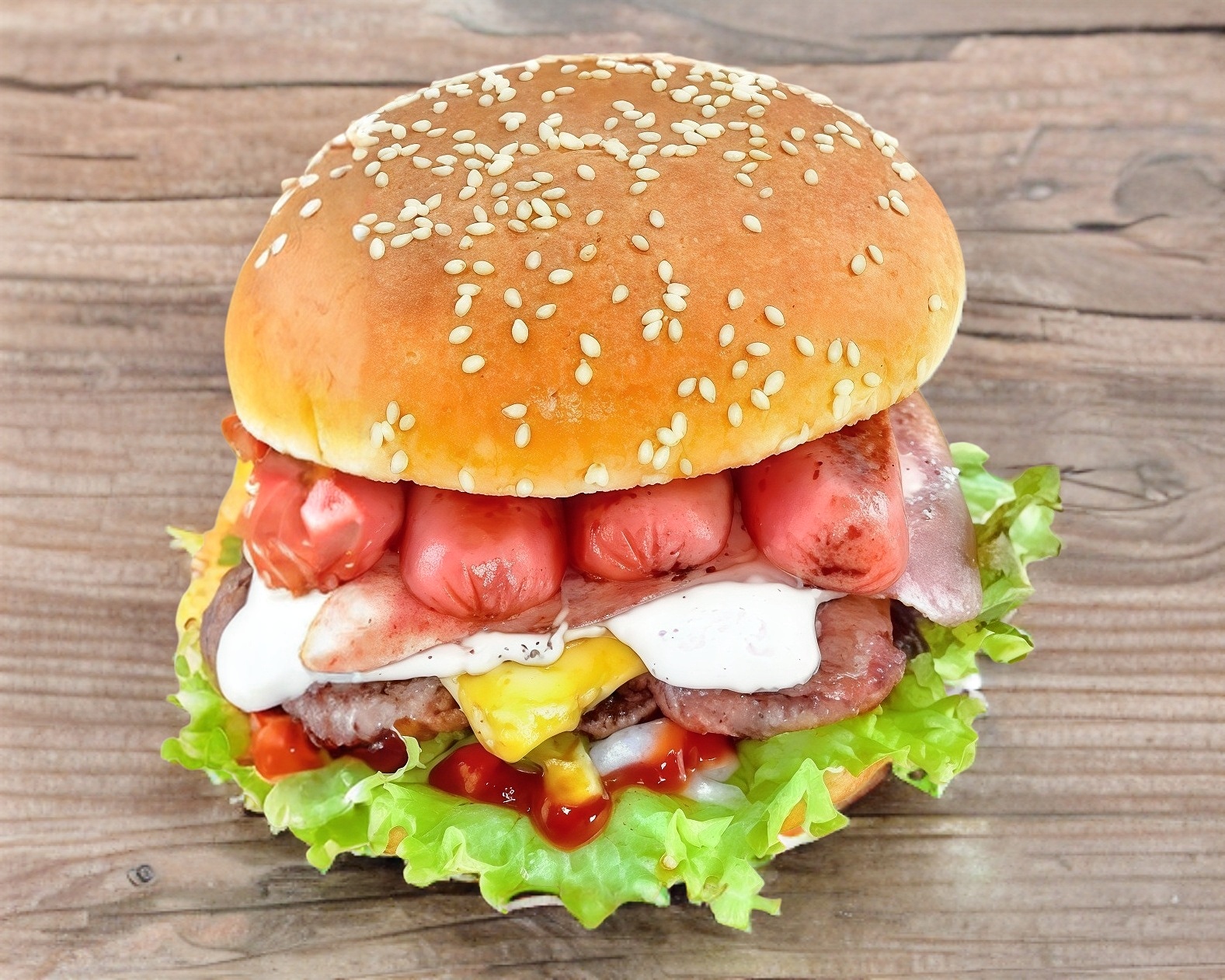 Hamburguesa con carne de res salchicha quesillo, jamón, queso amarillo y tocino