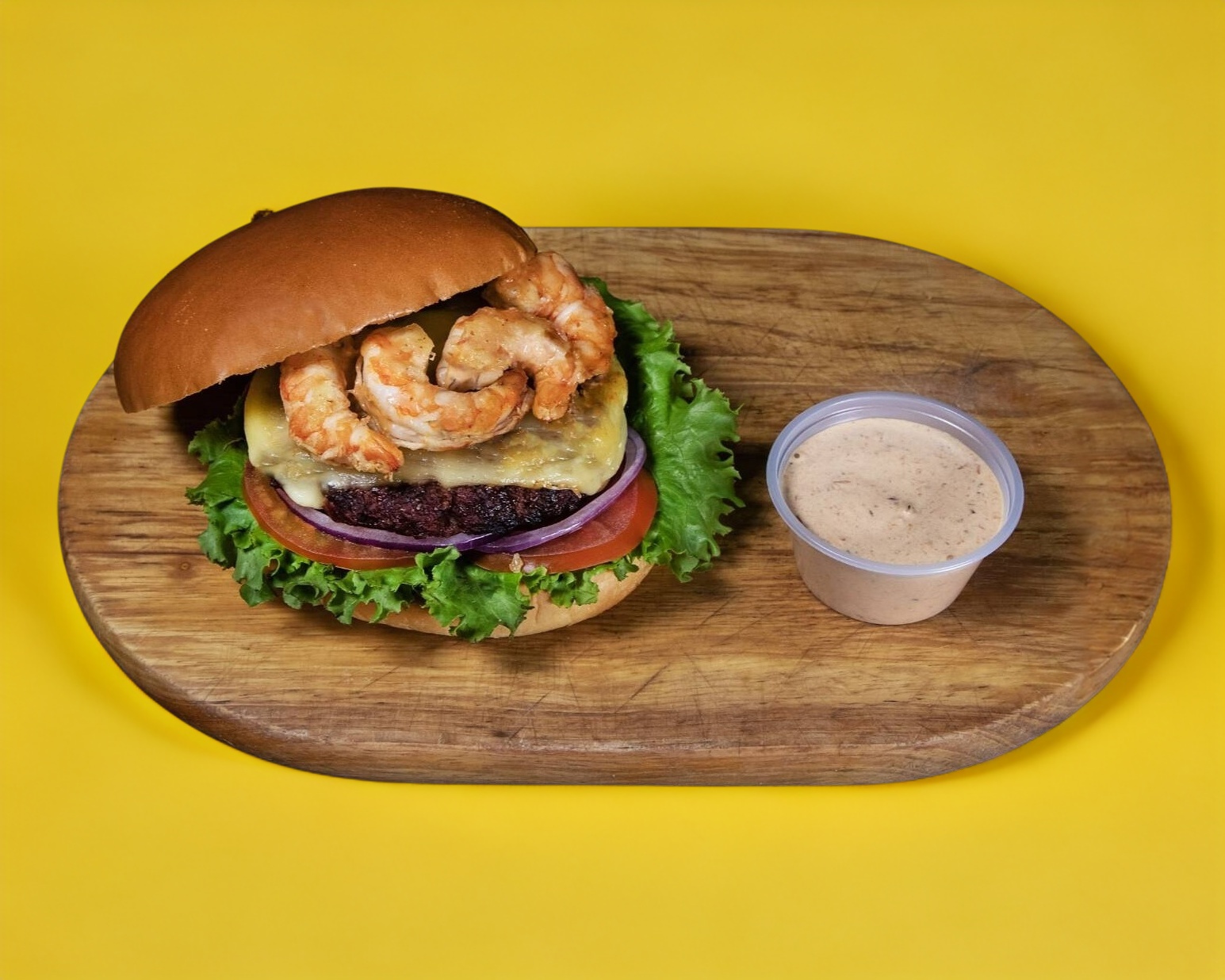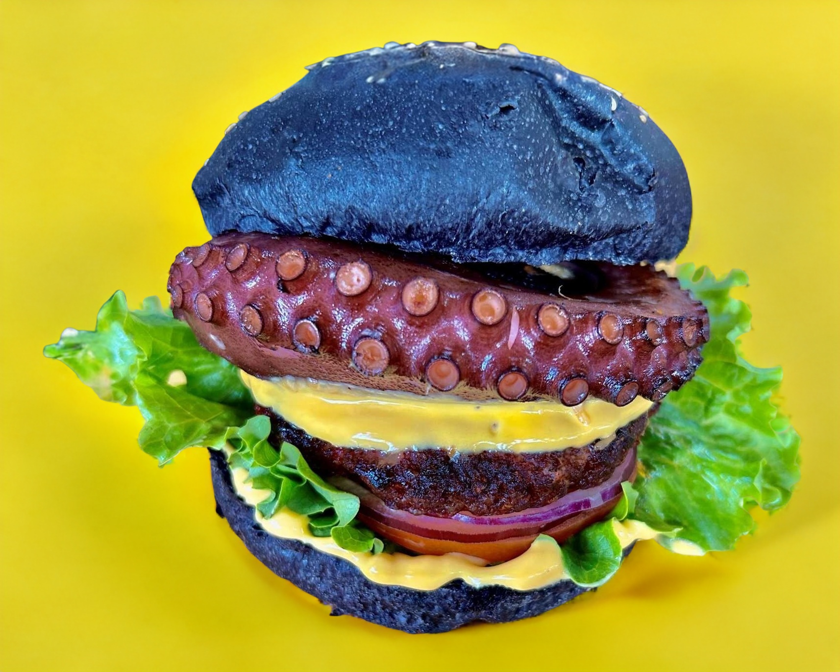 210gr de carne de res, 210gr de pulpo marinado con mantequilla, paprika, pimienta, pan brioche negro, queso cheddar, lechuga, jitomate, cebolla morada, aderezo de chipotle con mayonesa y papas