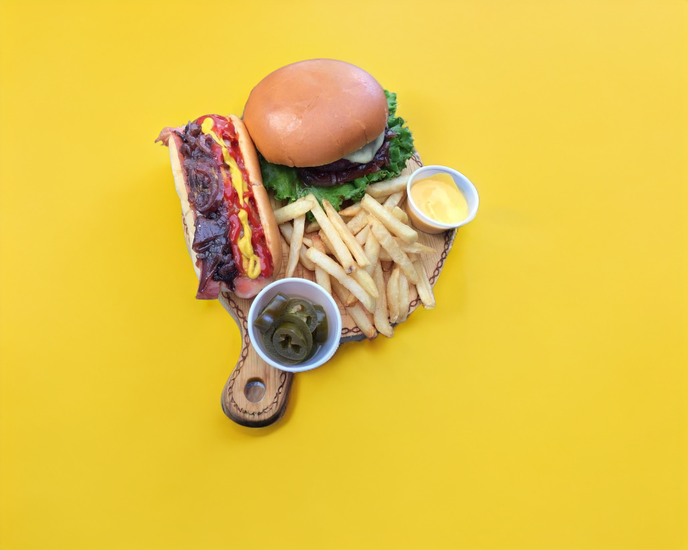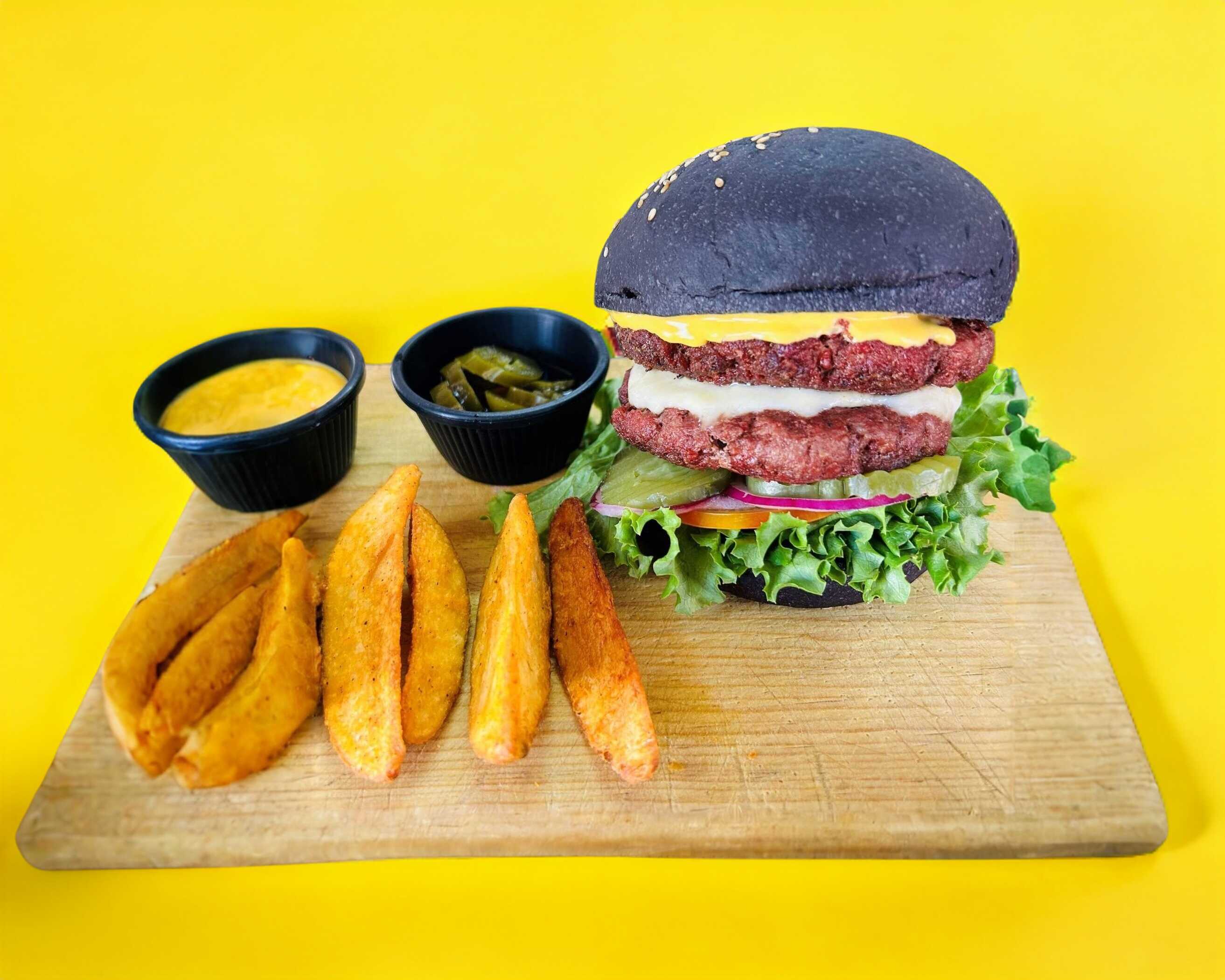 dos carnes de 210gr, pan brioche negro, queso cheddar, queso gouda, lechuga, jitomate, cebolla morada, pepinillos, mayonesa y papas