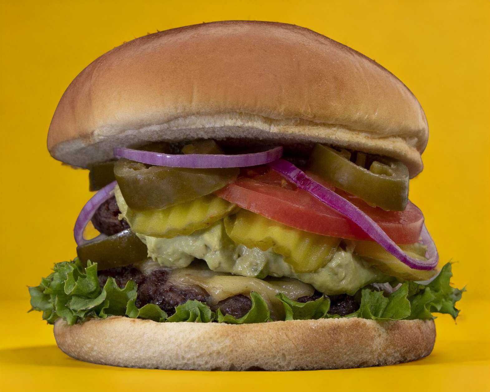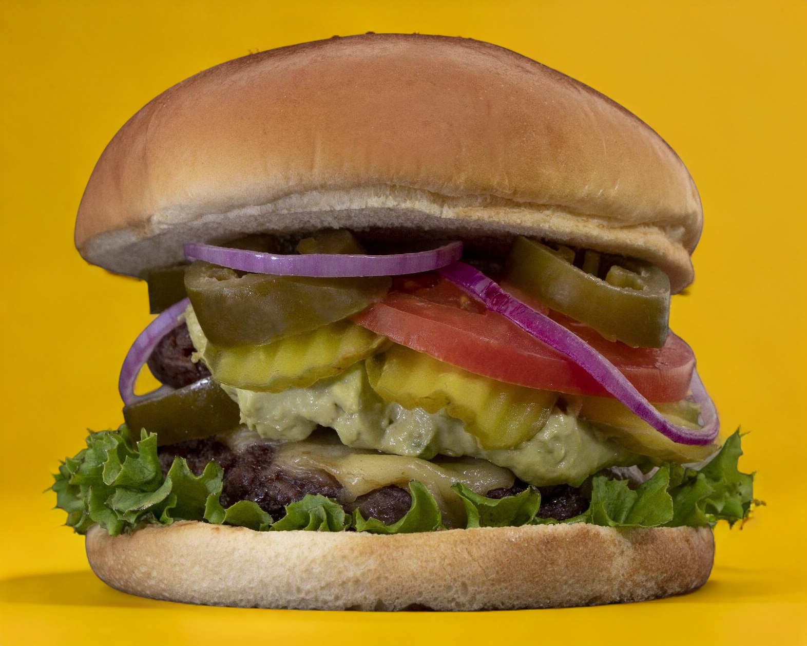 De res, 3 quesos, lechuga, jitomate, cebolla, pepinillos, aderezo mango habanero, envuelto con tocino y papas a la francesa.