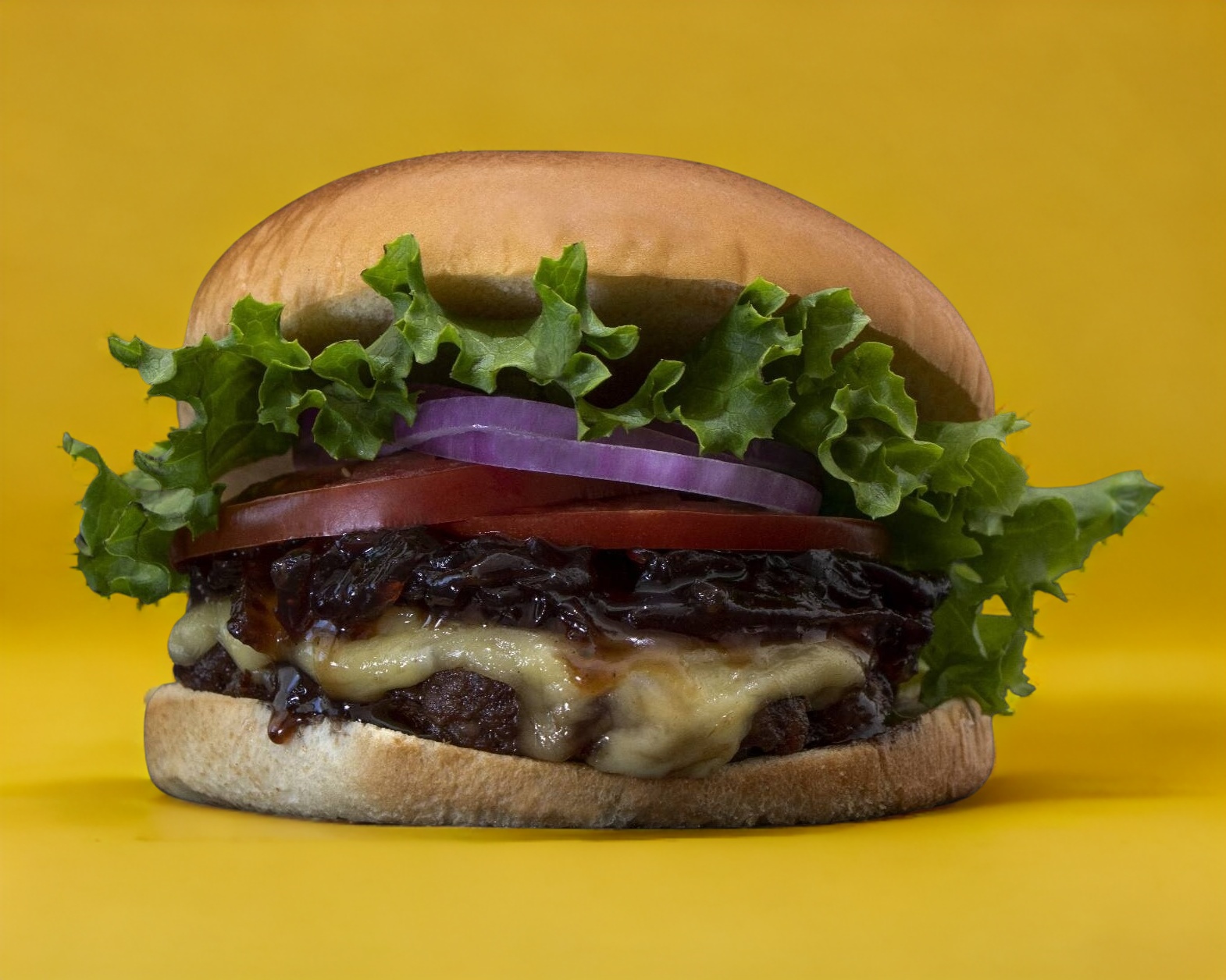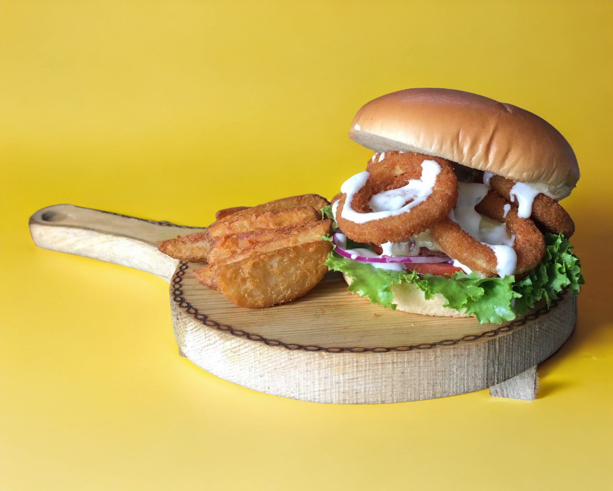 210 gr de carne de res, 4 aros de cebolla, adrezo ranch, lechuga, jitomate, cebolla, queso gouda, pepinillos, papas a la francesa o gajo