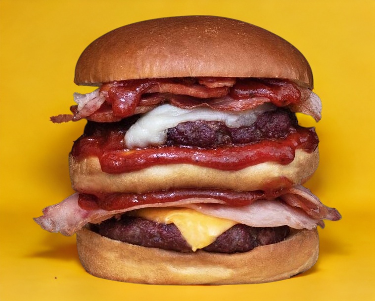 Dos carnes de res 210gr, tocino, jamón, queso mozzarella, queso cheddar con aderezo de tomate casero y pan brioche.