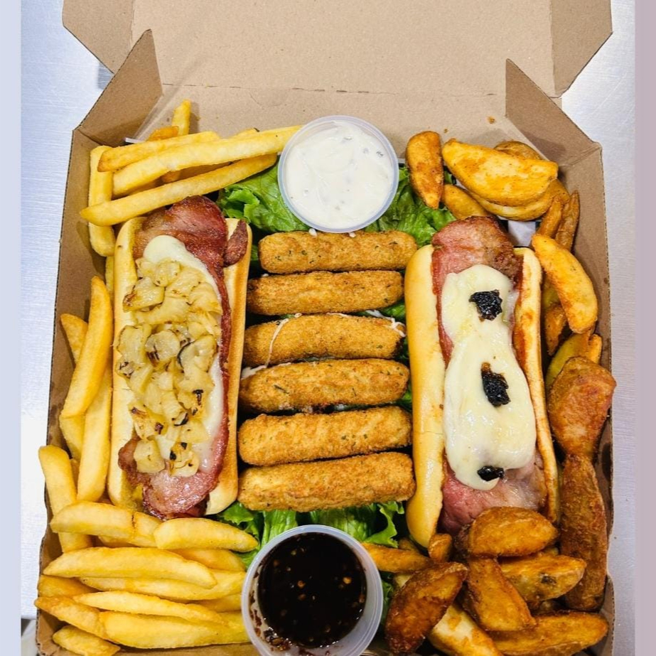 1 hot dog bacon, 1 hot dog hawaiano, 6 dedos de queso, papas gajo , papas a la francesa y aderezos.