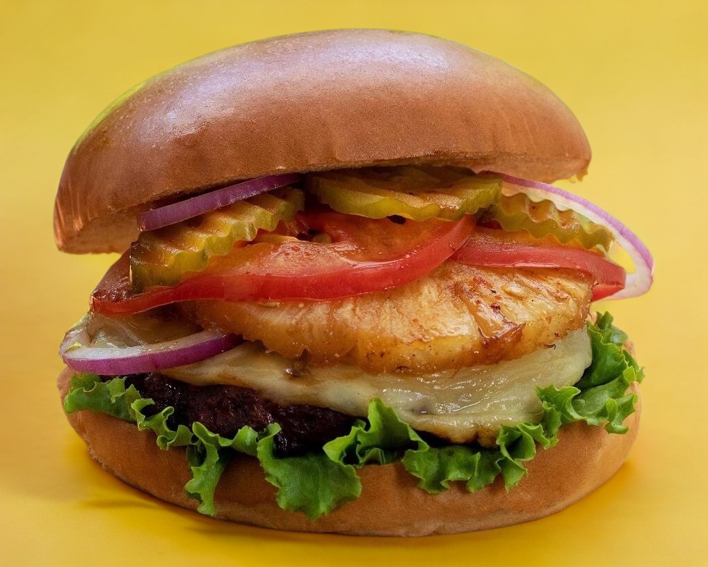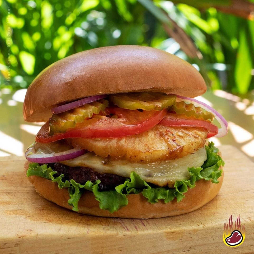 Carne de 210 gr, queso gouda, piña, lechuga, jitomate, cebolla morada , pepinillos , mayonesa, papas a la francesa.