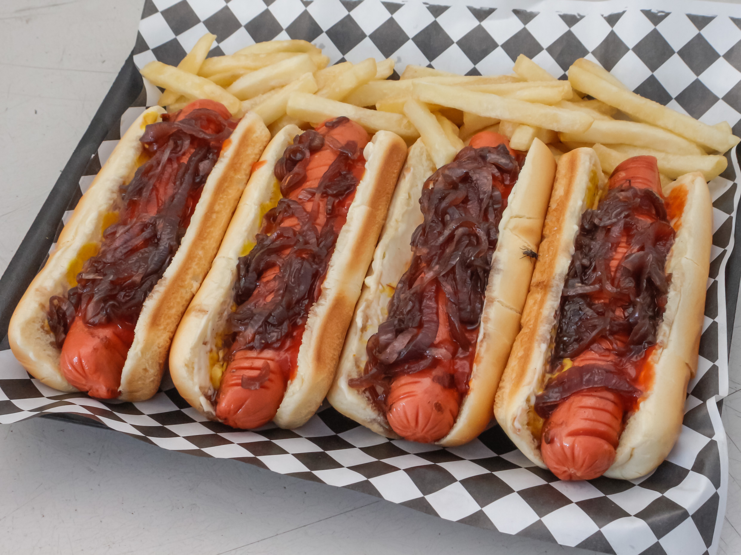 4 Hot sencillos, cebolla caramelizada, cátsup, mostaza, mayonesa, papas a la francesa, chiles de la casa