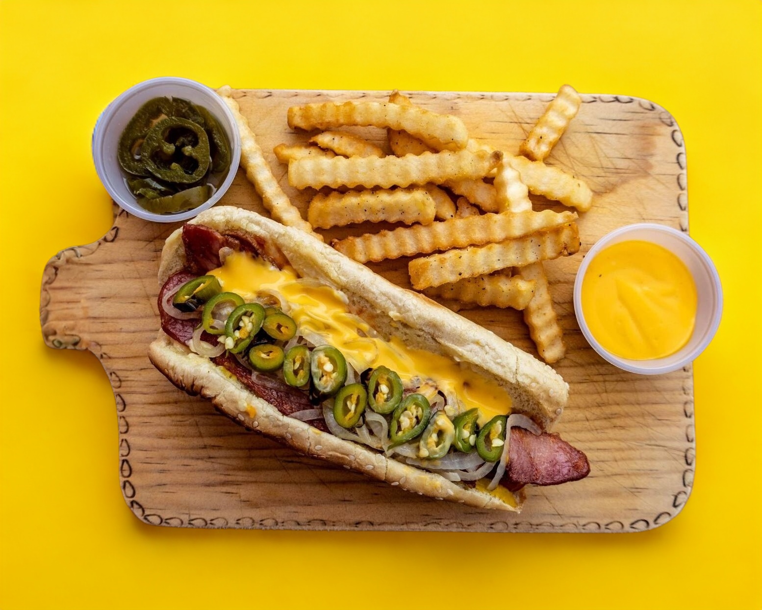 Salchicha de pavo jumbo, tocino, cebolla azada, chies toreados, queso cheddar, mayonesa, mostaza y catsup.