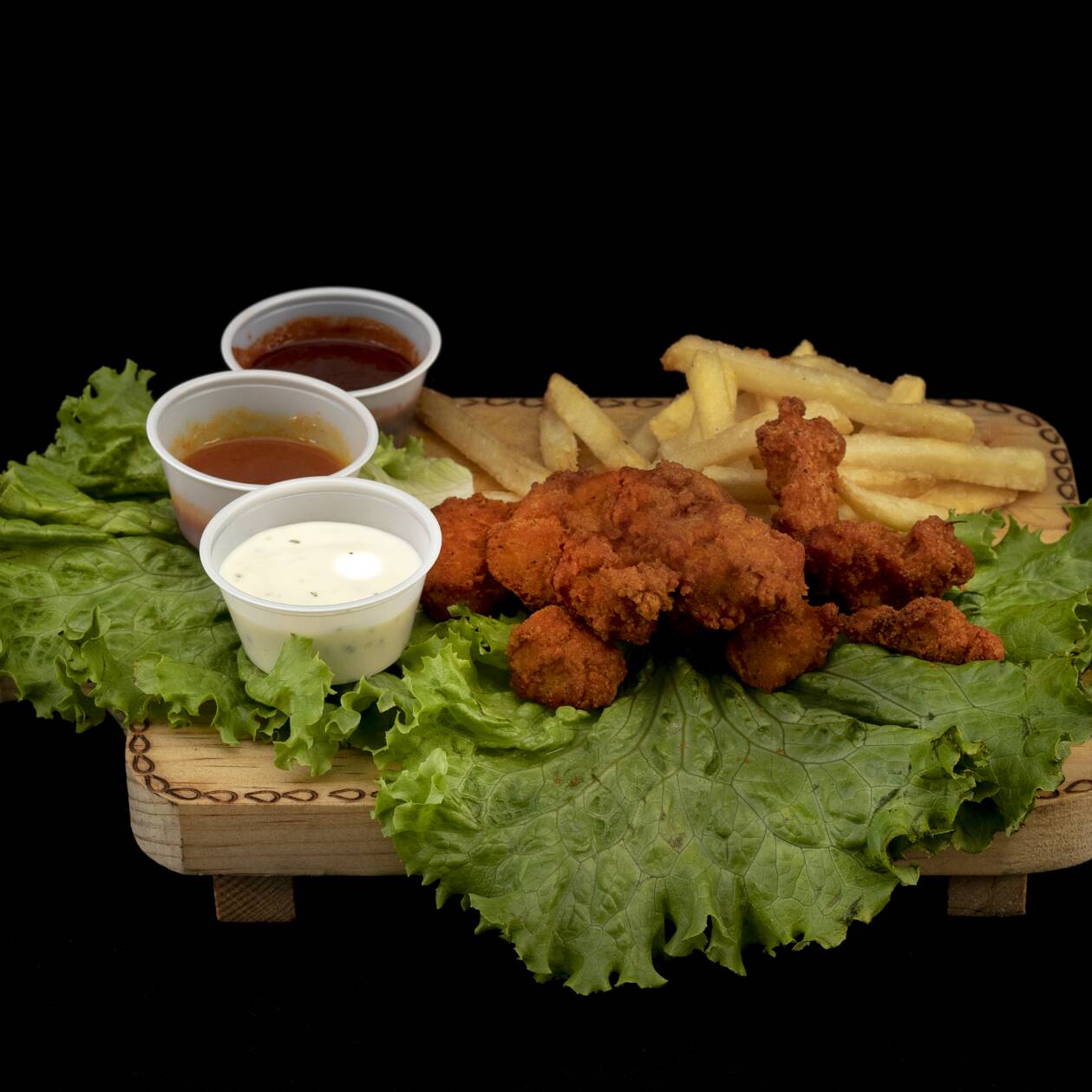 8 Piezas de boneless de pollo natural, aderezo de la casa, ranch, papas a la francesa o gajo