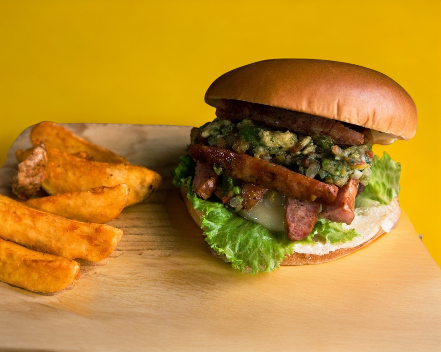 Chorizo argentino ahumado con queso gouda y chimichurri acompañado con papa francesa o gajo