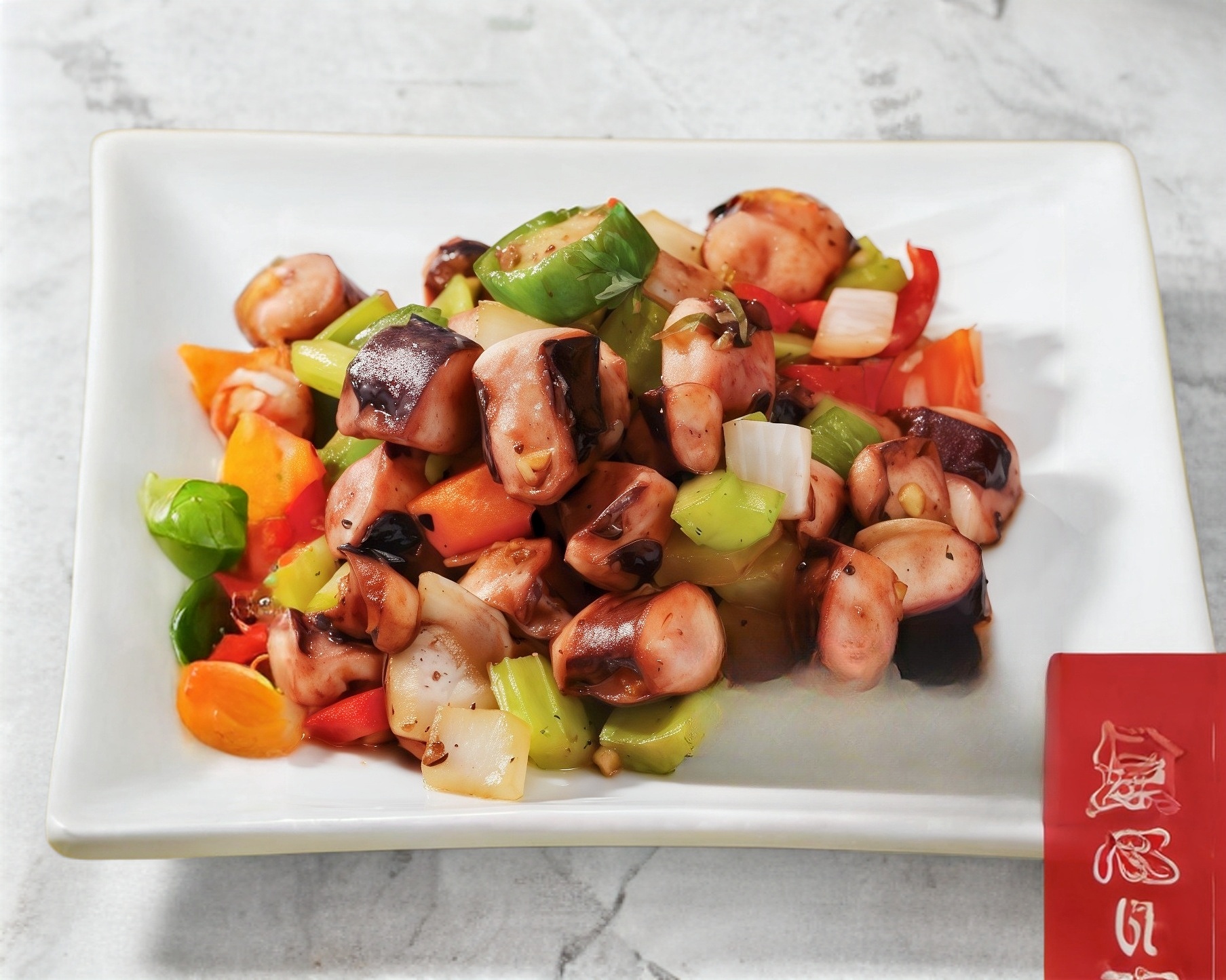 Arroz frito con pollo zanahoria calabaza y cebollín
