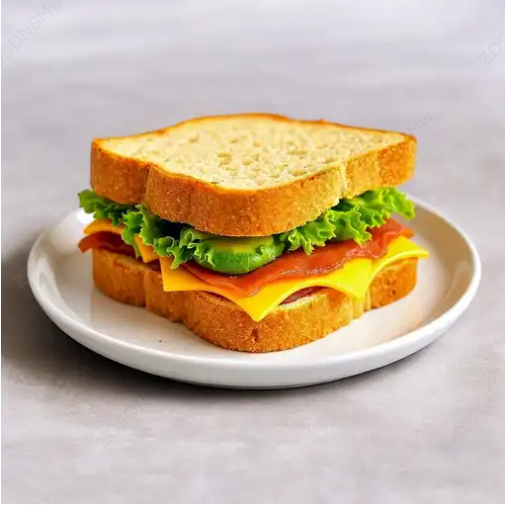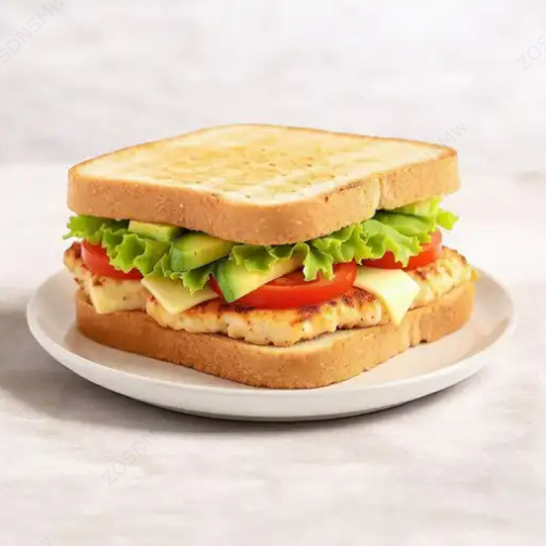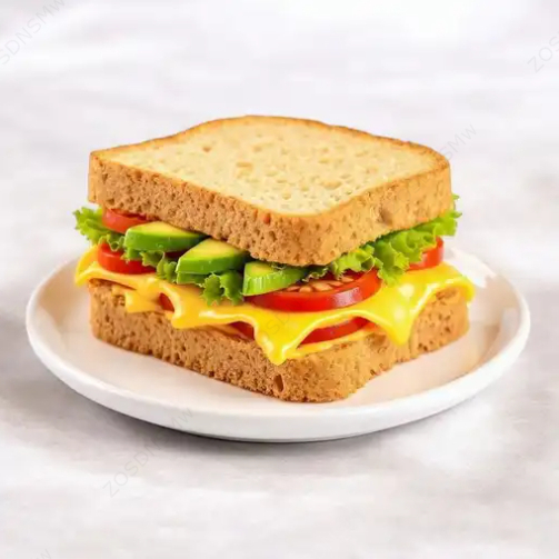 Pan integral, queso derretido, mayonesa, jitomate, aguacate, picante y lechuga.