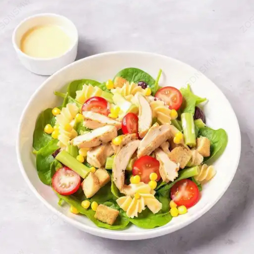Base mixta (espinaca y lechuga), pollo, jitomate, pasta, fresa, apio, elote, crotones y ranch.
