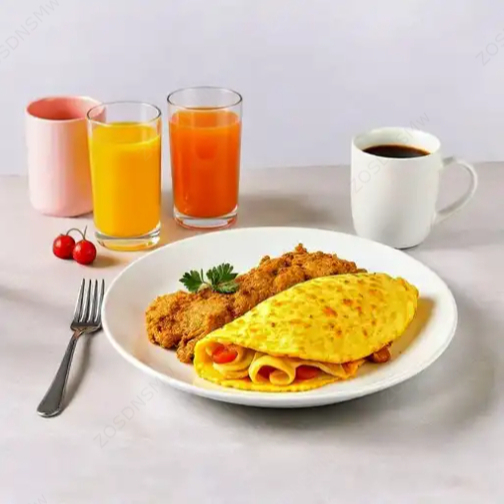 Elige entre un omelette clásico o un sándwich de pollo, acompañado de un vaso de jugo de naranja natural o una taza de café caliente.