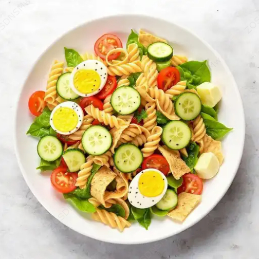 Base mixta (espinaca y lechuga), jitomate, pepino, pimiento, huevo duro, pasta, tortilla en tiras, vinagreta y chía.