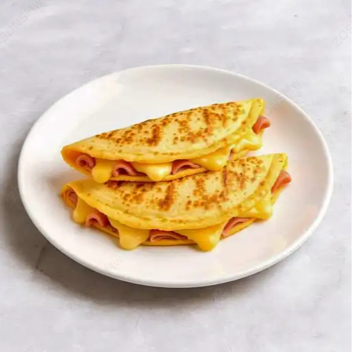 Tortillas de harina rellenas de jamón y queso, selladas y preparadas para una textura crujiente (2 pzas).