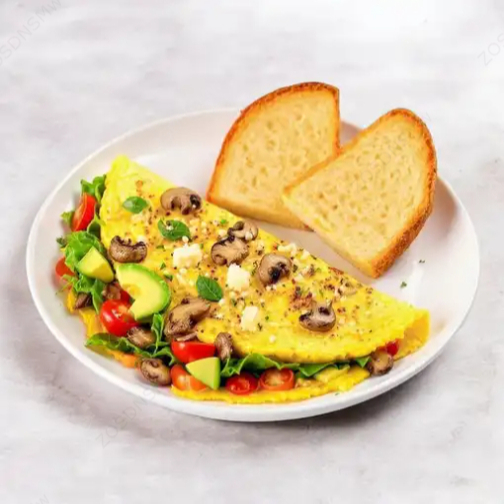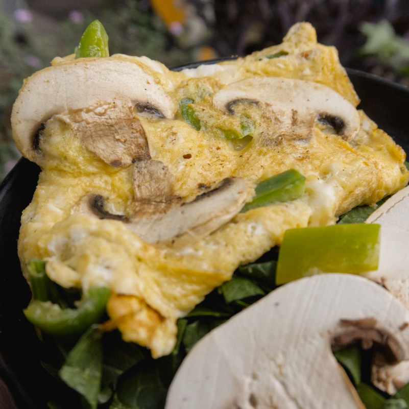 Huevo, mix de quesos (manchego, oaxaca y chihuahua), champiñón, pimiento, lechuga, espinaca, jitomate, aguacate y dos piezas de pan tostado.