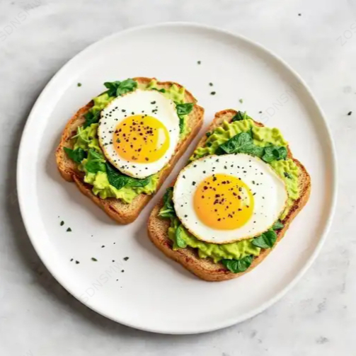 Dos pzas de pan integral tostado, aguacate, espinaca, huevo estrellado.