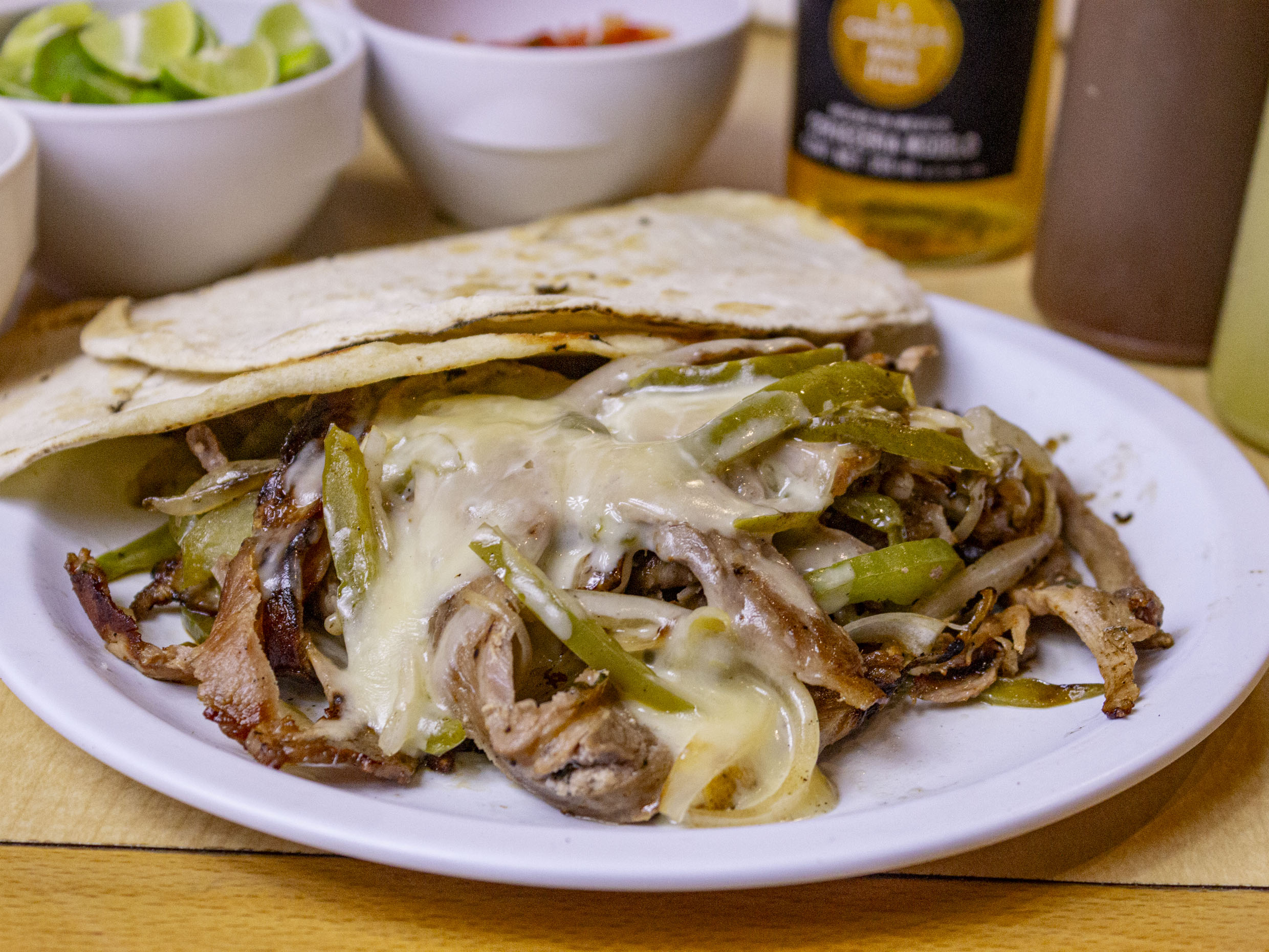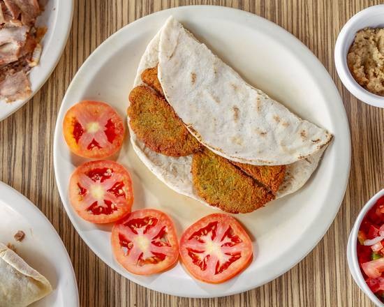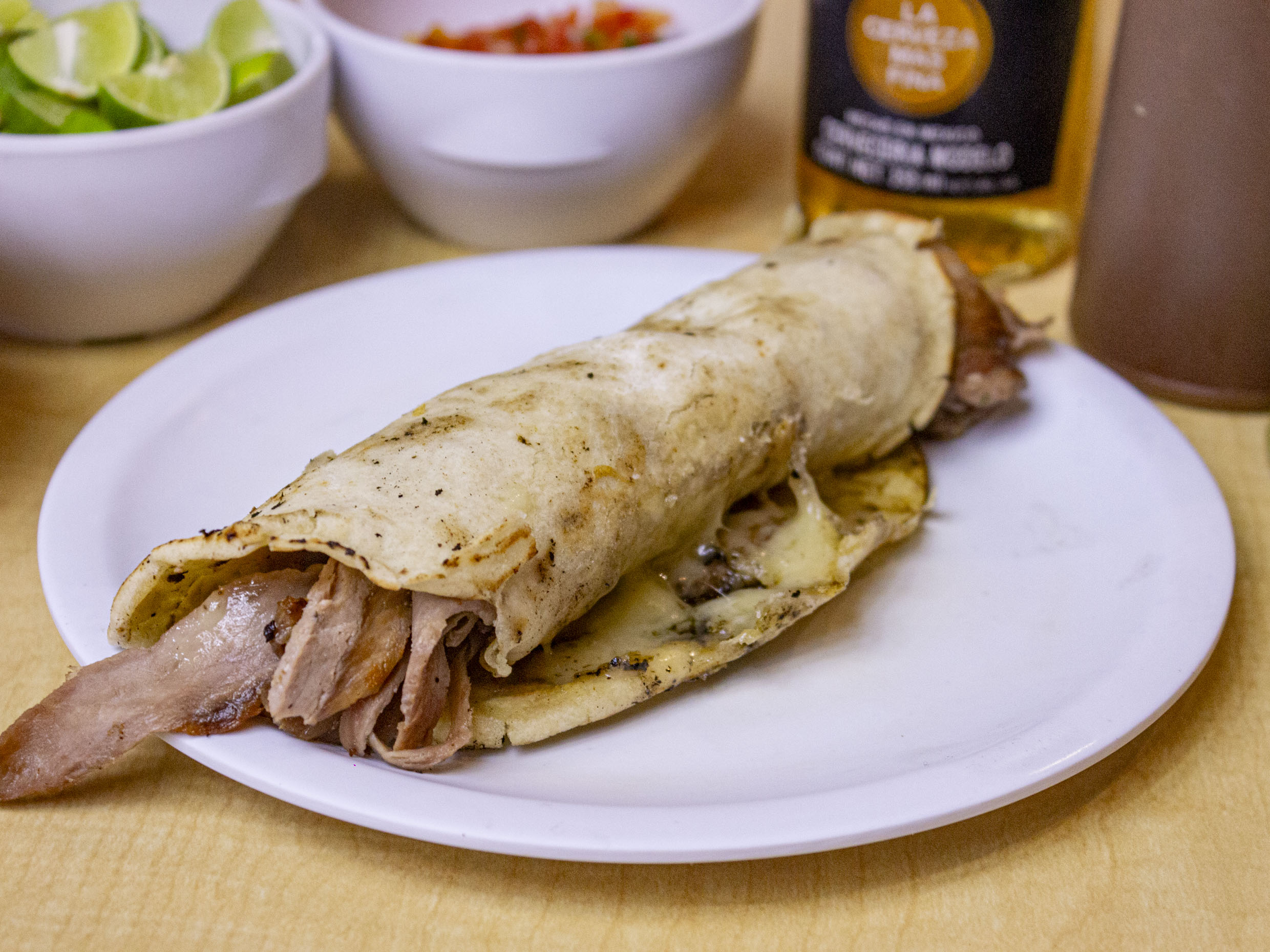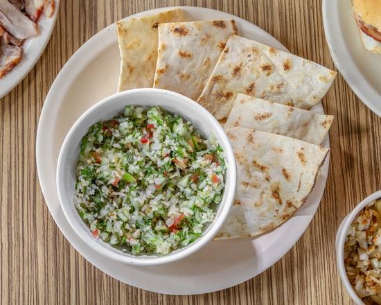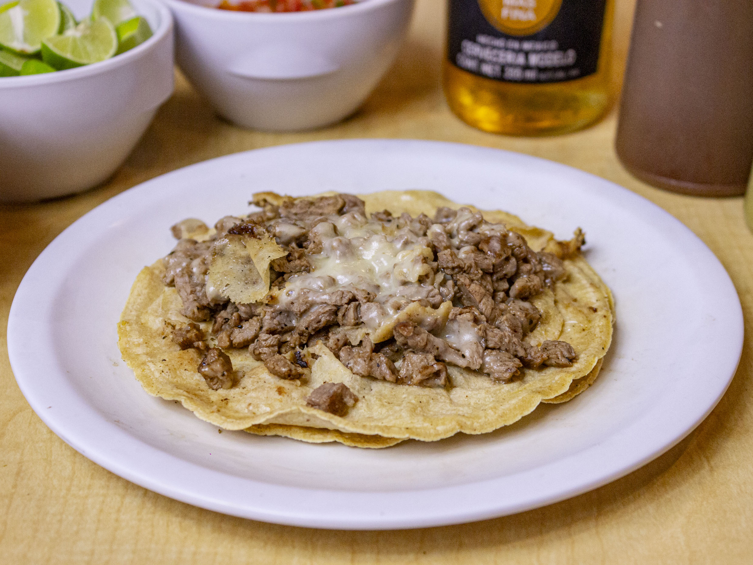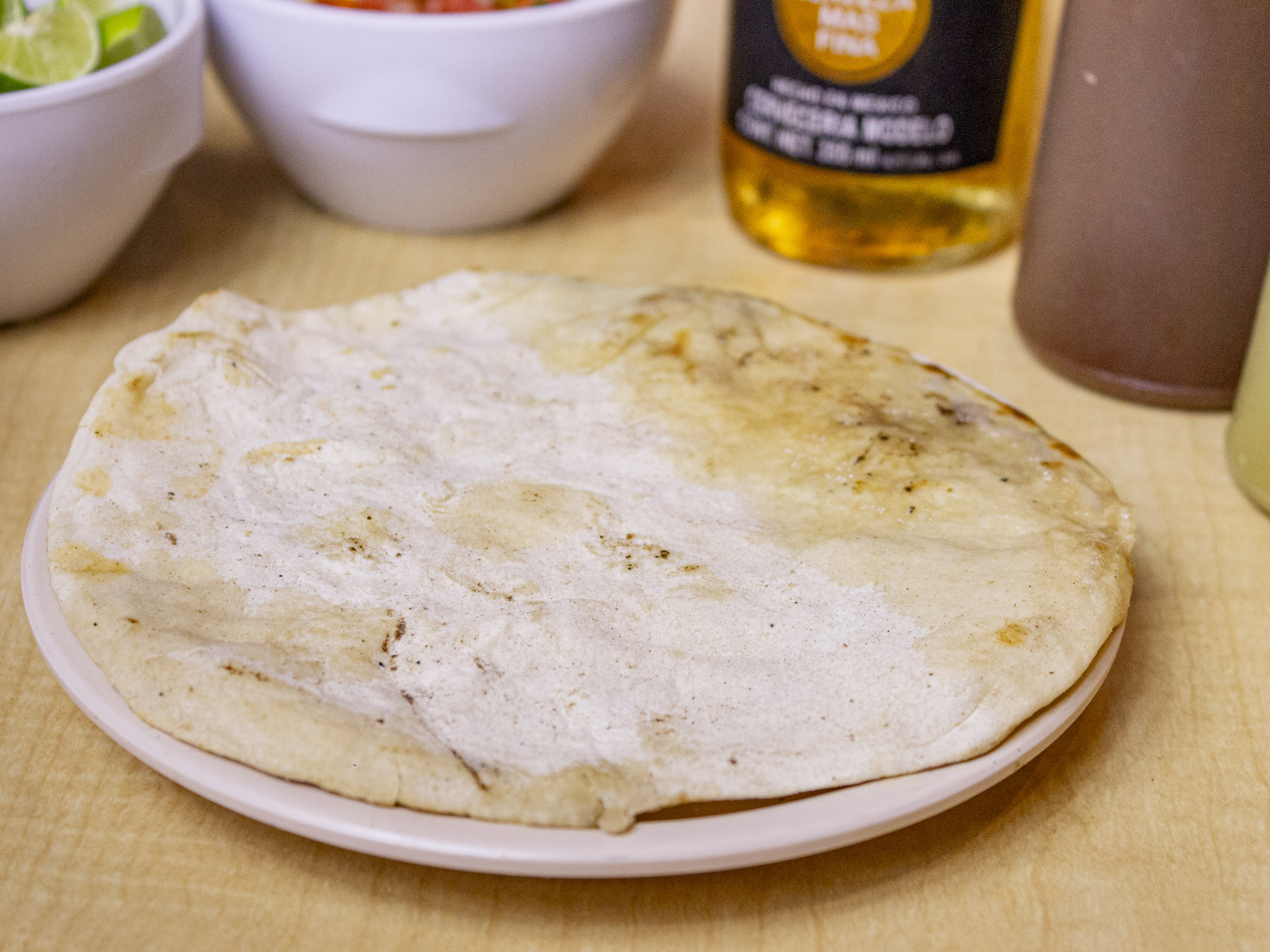 Torta Árabe con Queso Gouda, Carne Árabe y Salsas verde y Roja a parte para el gusto del cliente.
