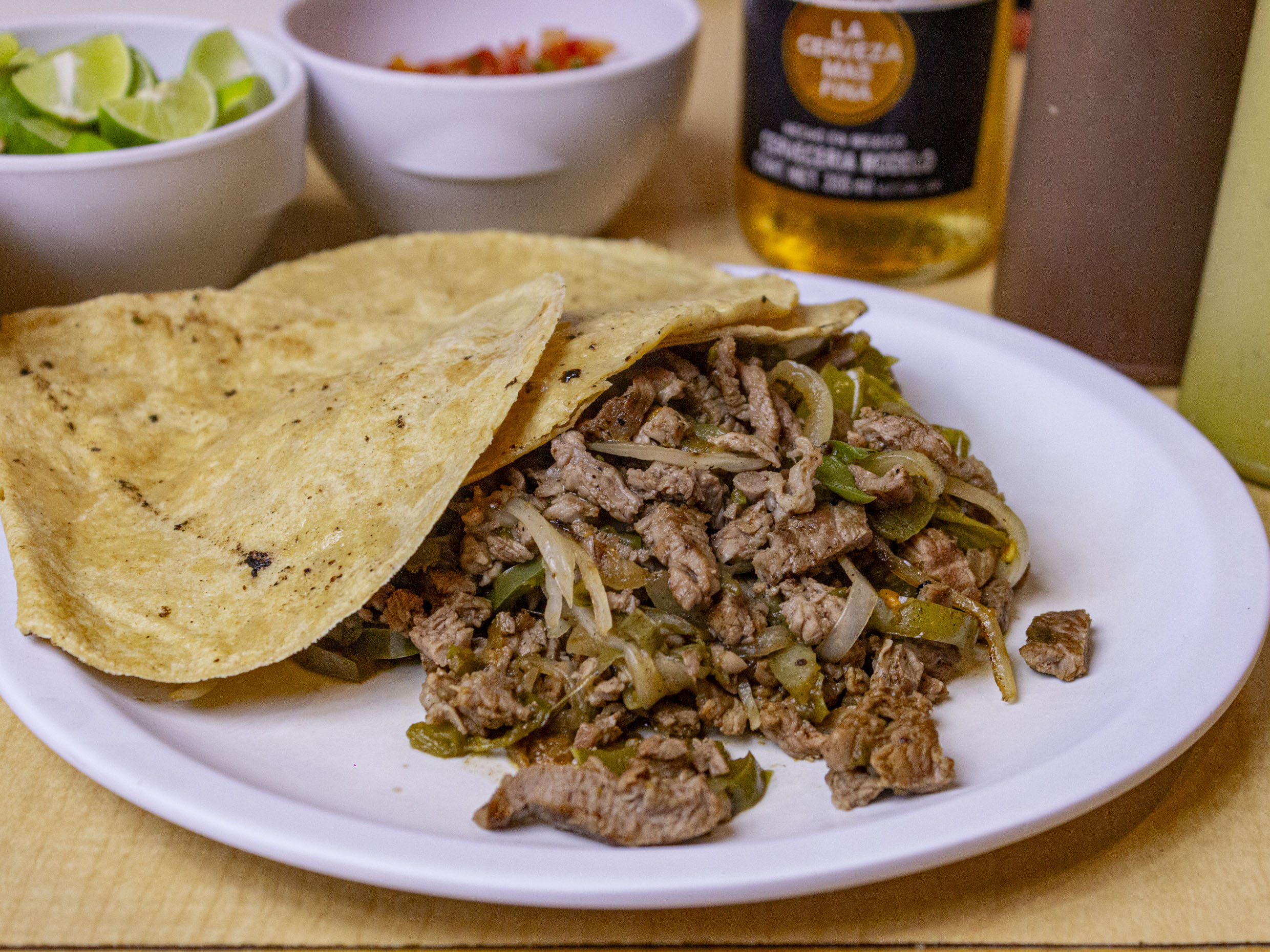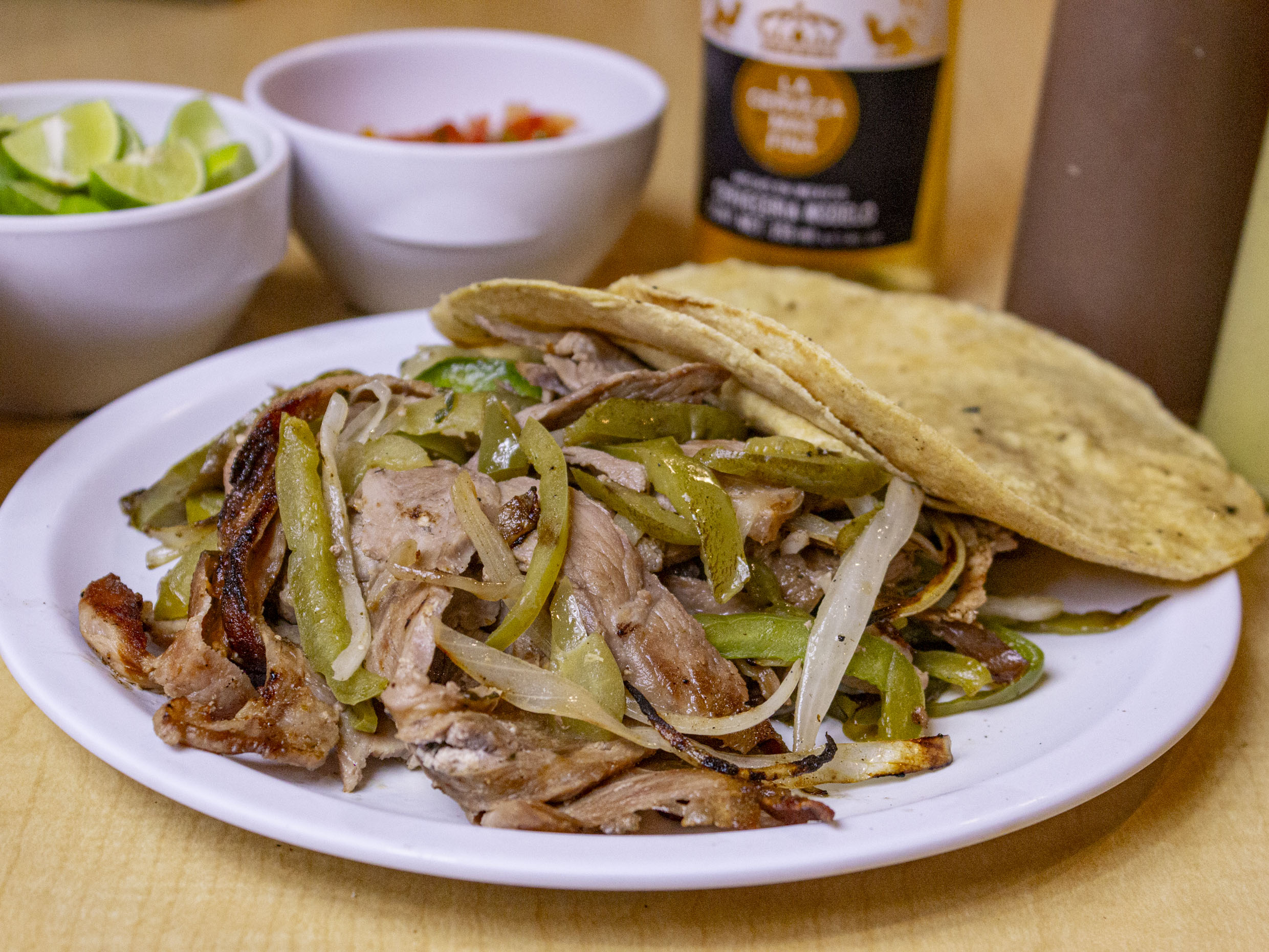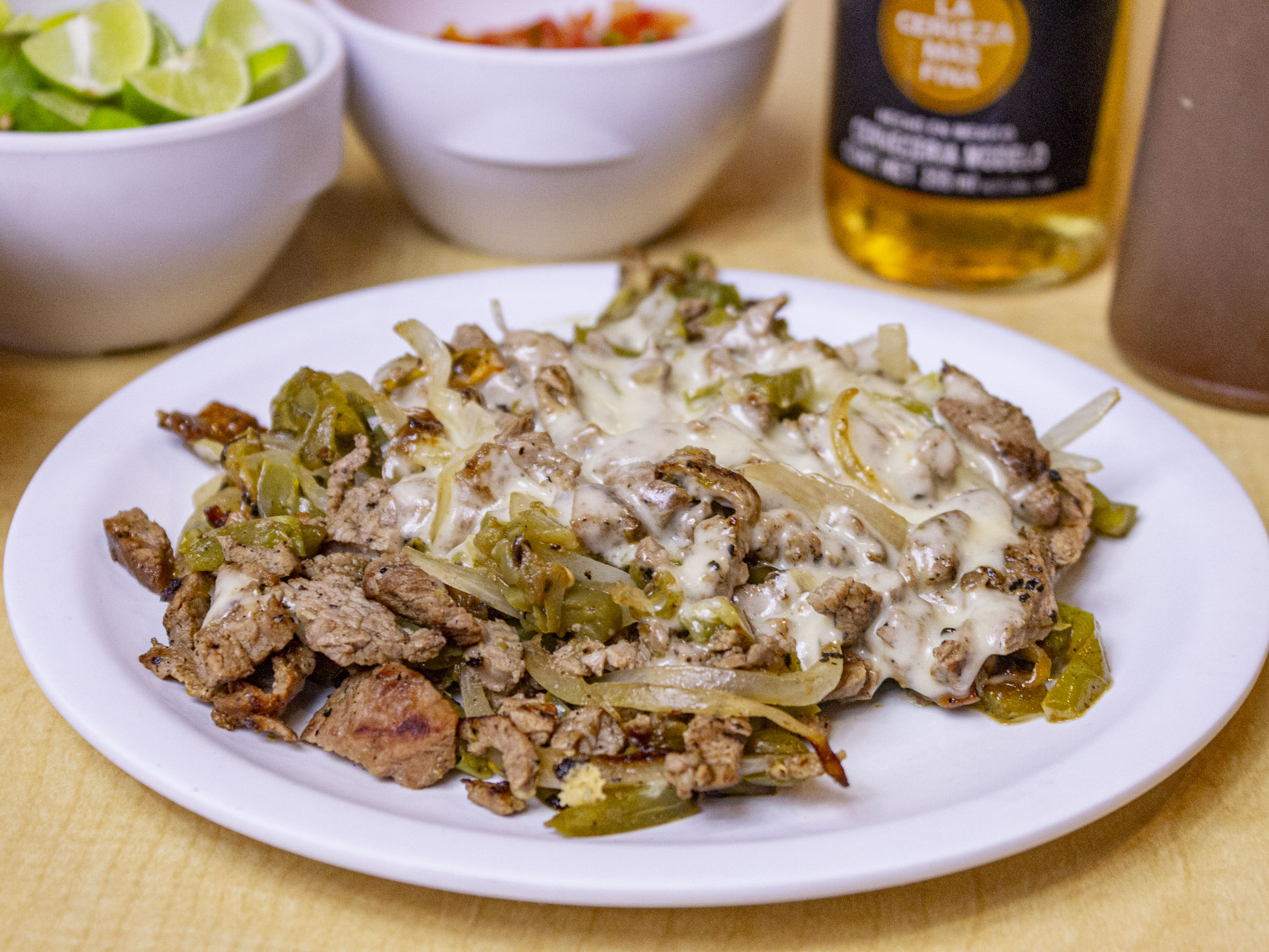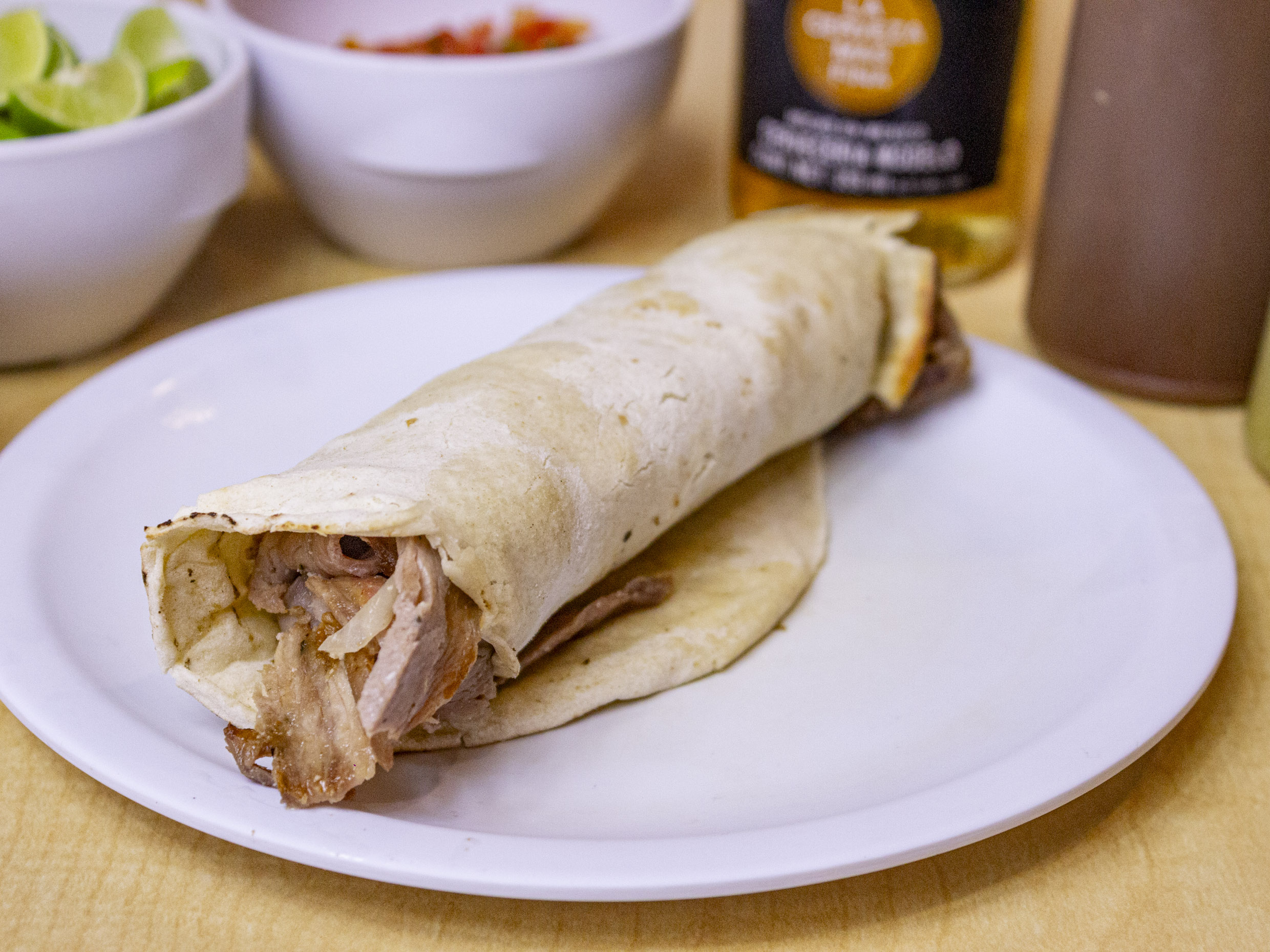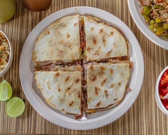 Torta Árabe con Queso Gouda, Carne Árabe y Salsas verde y Roja a parte para el gusto del cliente.