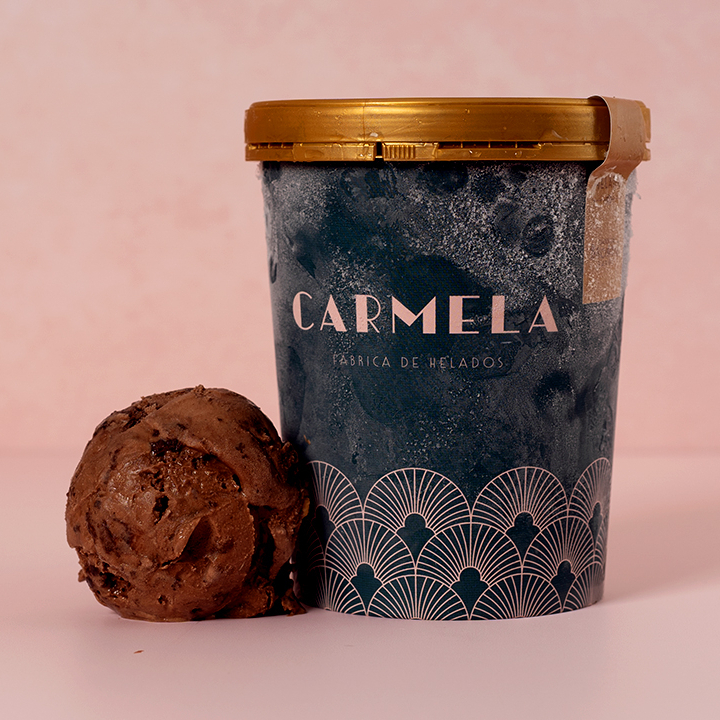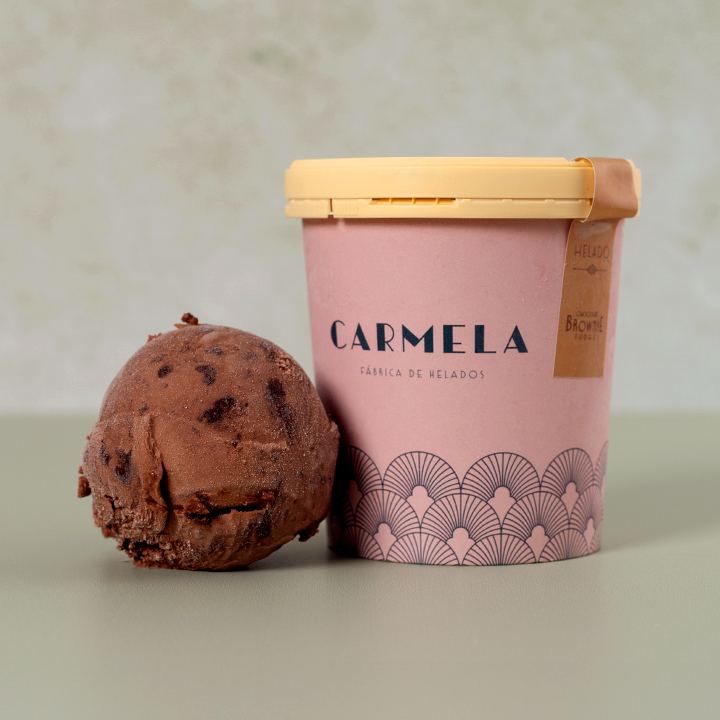 Delicioso helado de chocolate con trozos de brownie y un listón de fudge.