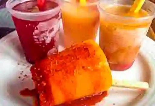 Deliciosa nieve de fruta natural de temporada acompañada de chamoy, miguelito y paleta de pulpa de tamarindo