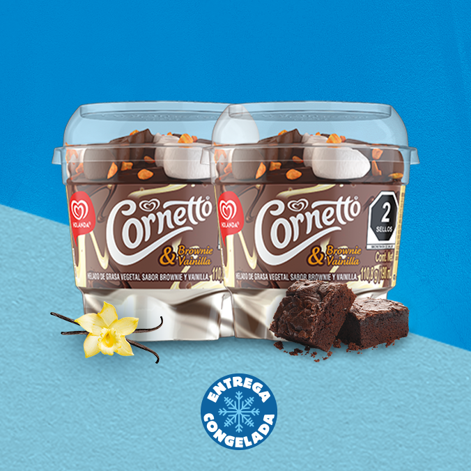 Dos copas de helado de grasa vegetal sabor brownie y vainilla de 120ml cada una. Una mezcla deliciosa que te encantará.