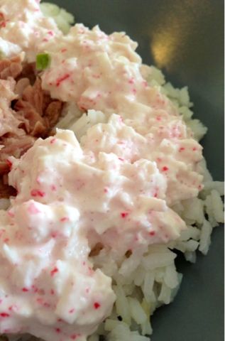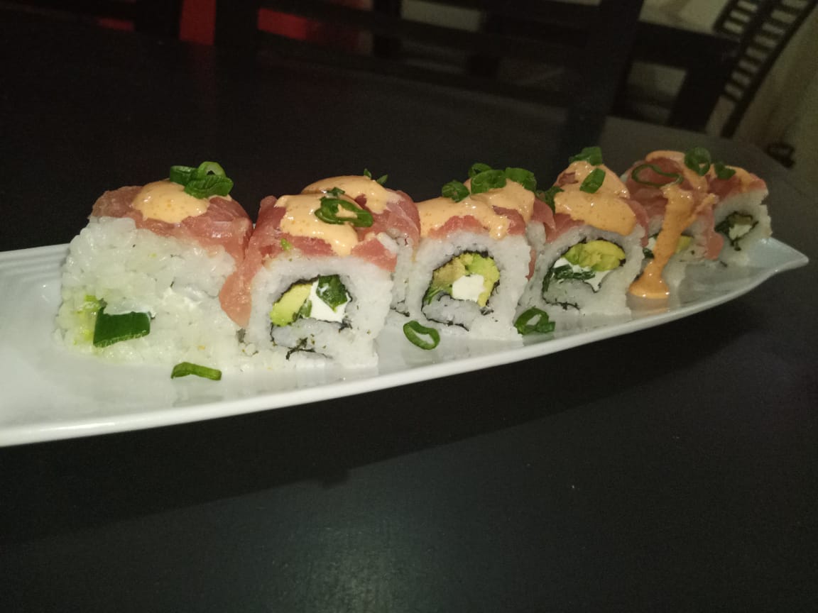 Por dentro: queso, aguacate y cebollín. Por fuera: atún servido con salsa spaicy y cebollín.