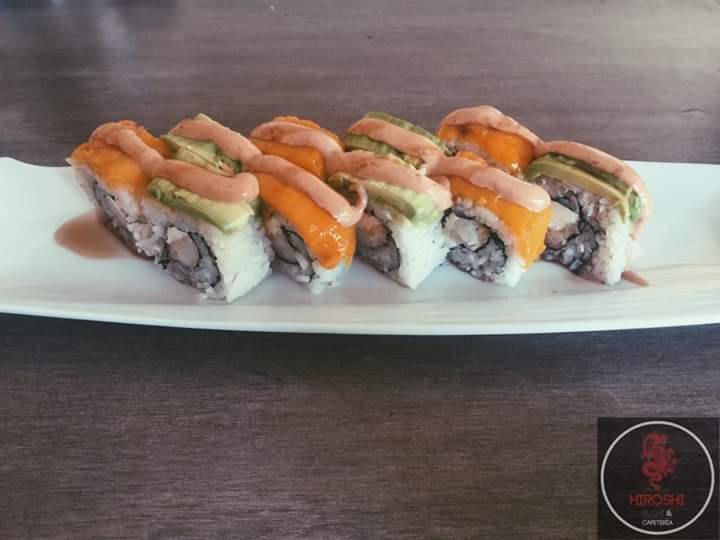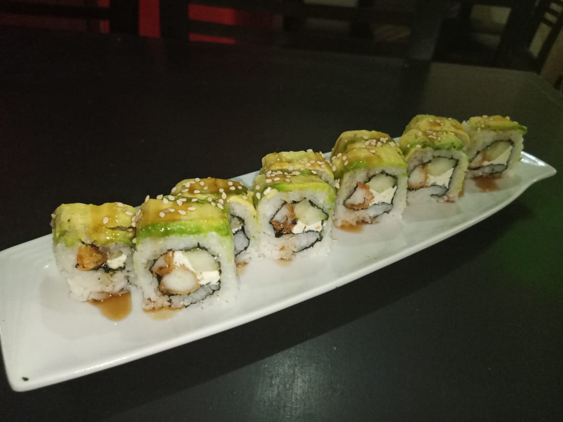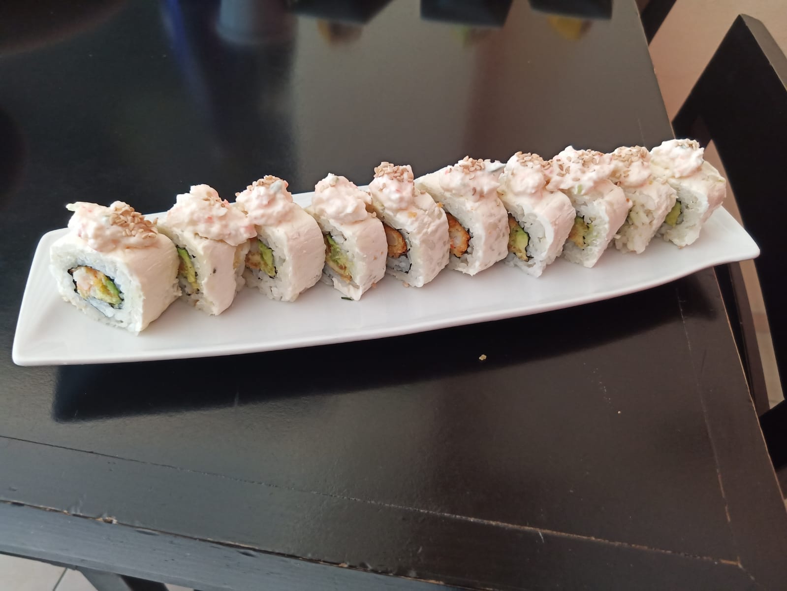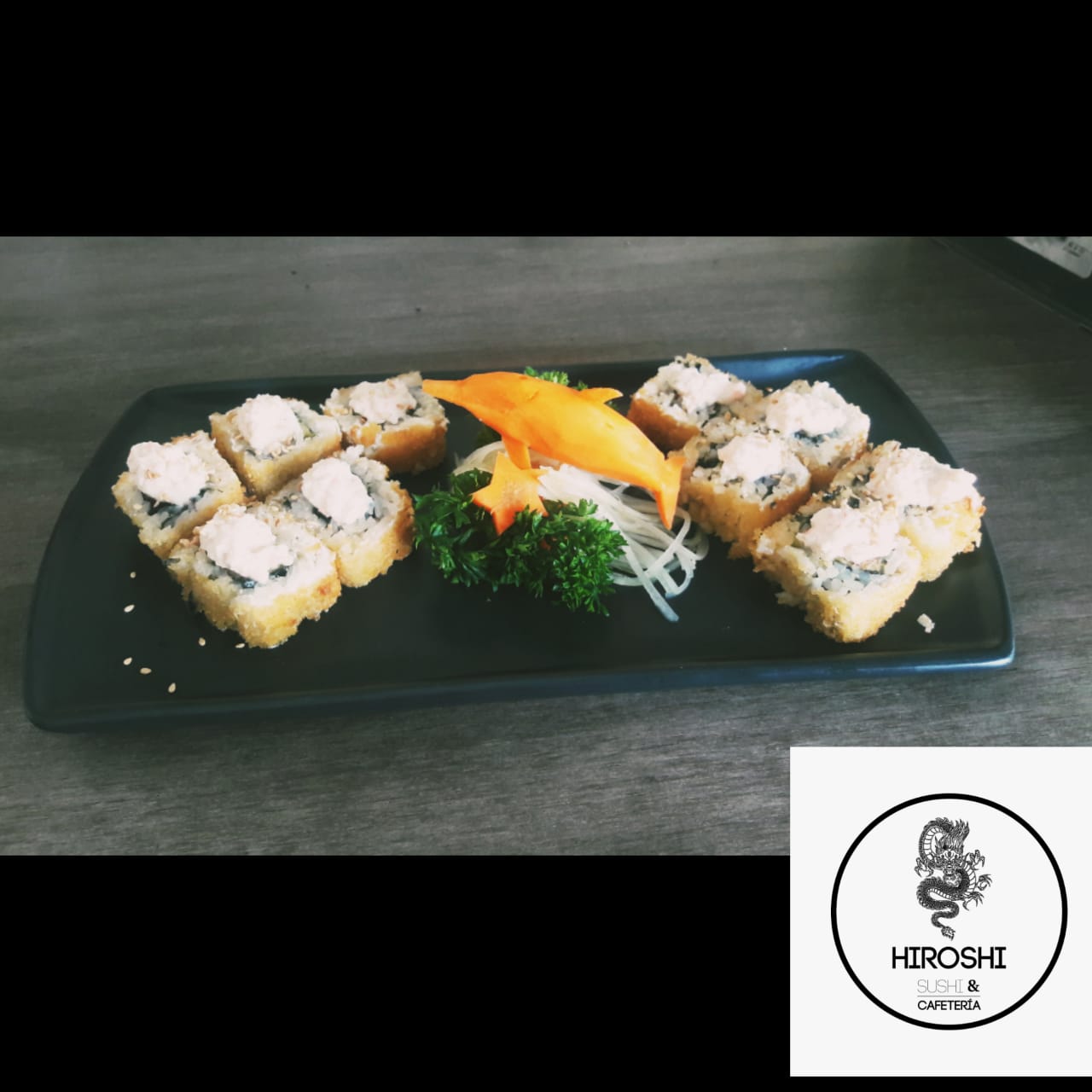 Por dentro: cangrejo, aguacate, queso, chiles toreados y cebollín por fuera salsa tampico.