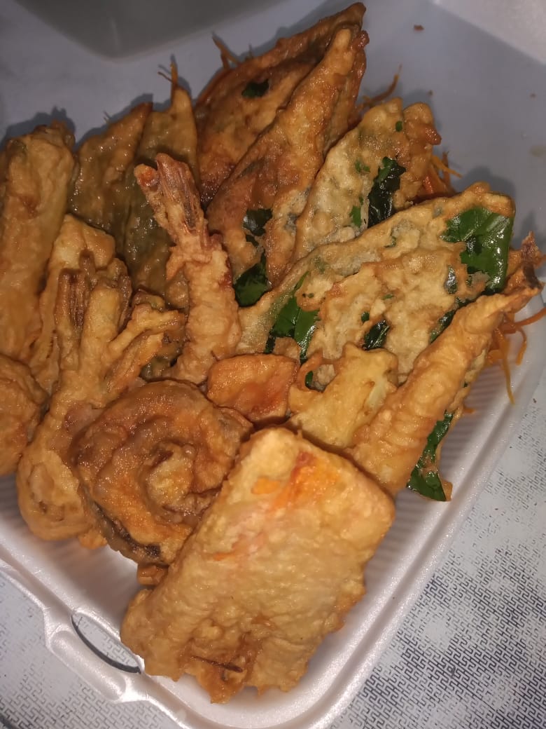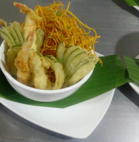 Verduras crocantes y 3 piezas de camarón al tempura.