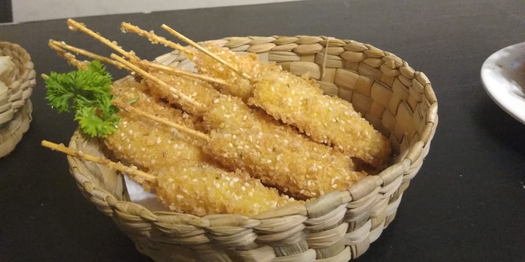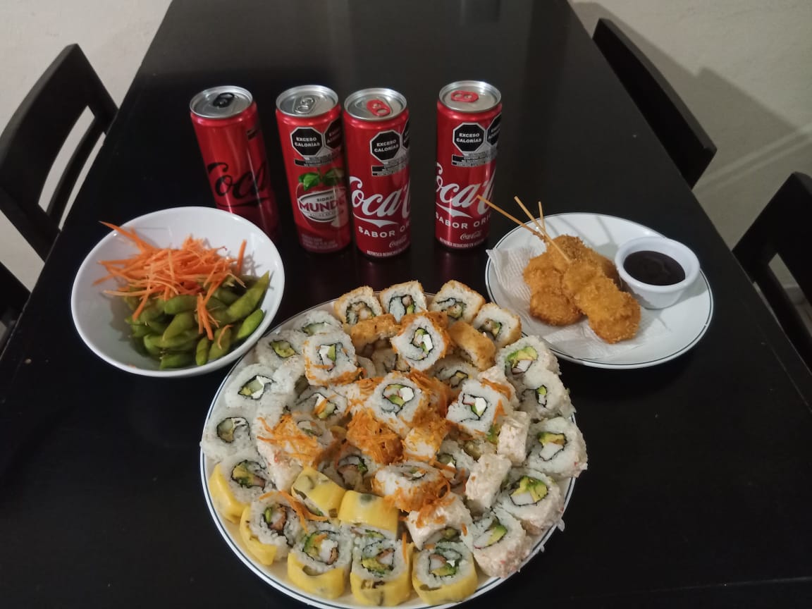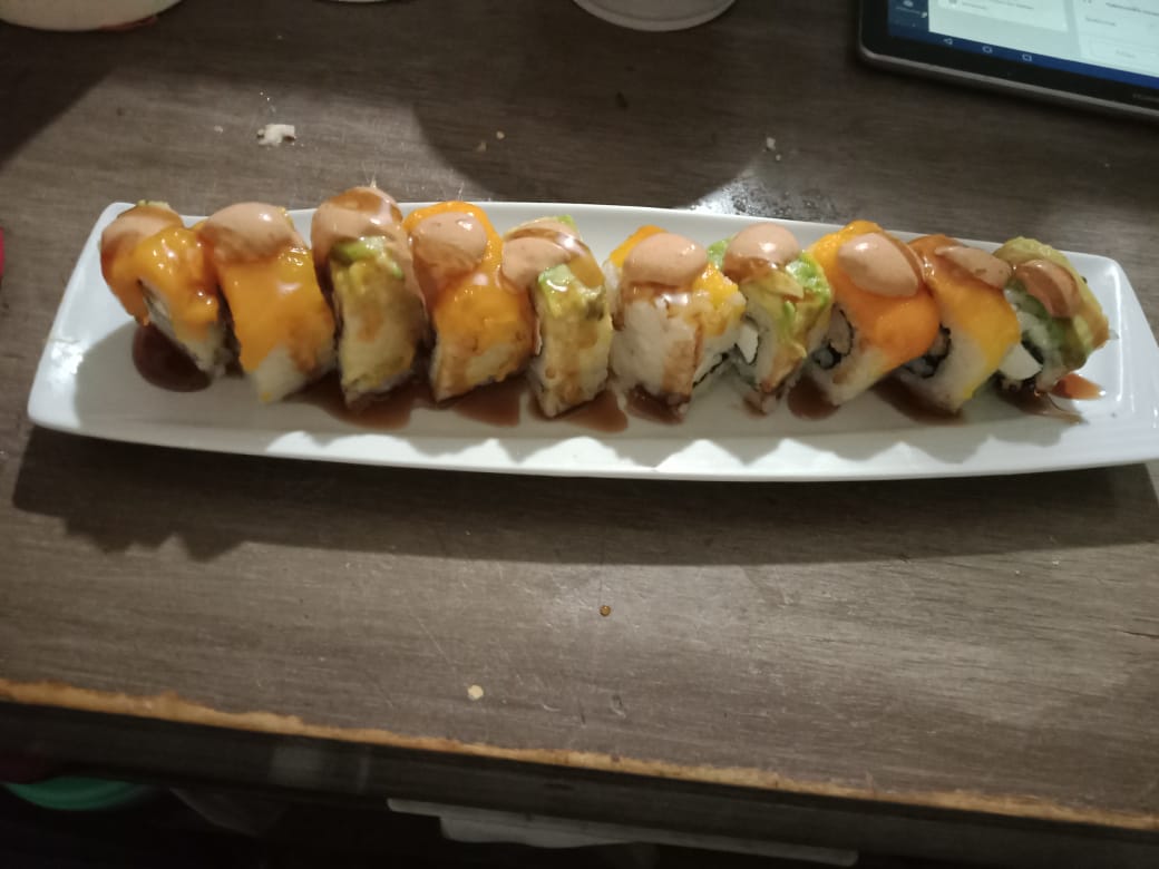 1 Rollo byako, 1 rollo samurái fri, 1 rollo tampico roll, 1 rollo susaku, 1 california de surimi,, 3 kushiage de plátano con queso .