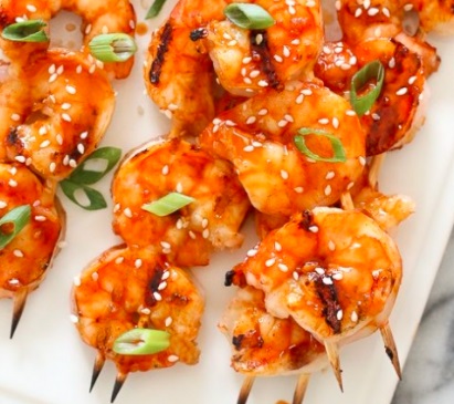 Combinación de camarón y verduras, elaboradas a la plancha en nuestra cocina, acompañadas con salsa de ajonjolí y gohan.