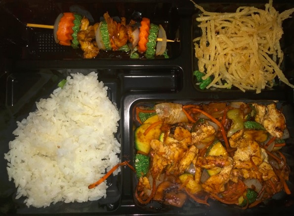 Teppanyaki de verduras con pollo asado a la plancha, gohan al vapor, yakitori de pollo y kakiage de papa.