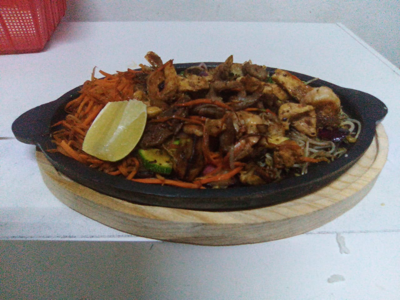 Tallarín japonés asada con cebollín, champiñón, zanahoria y mixto, (pollo, filete y camarón), sazonado con mantequilla y salsa elegir.