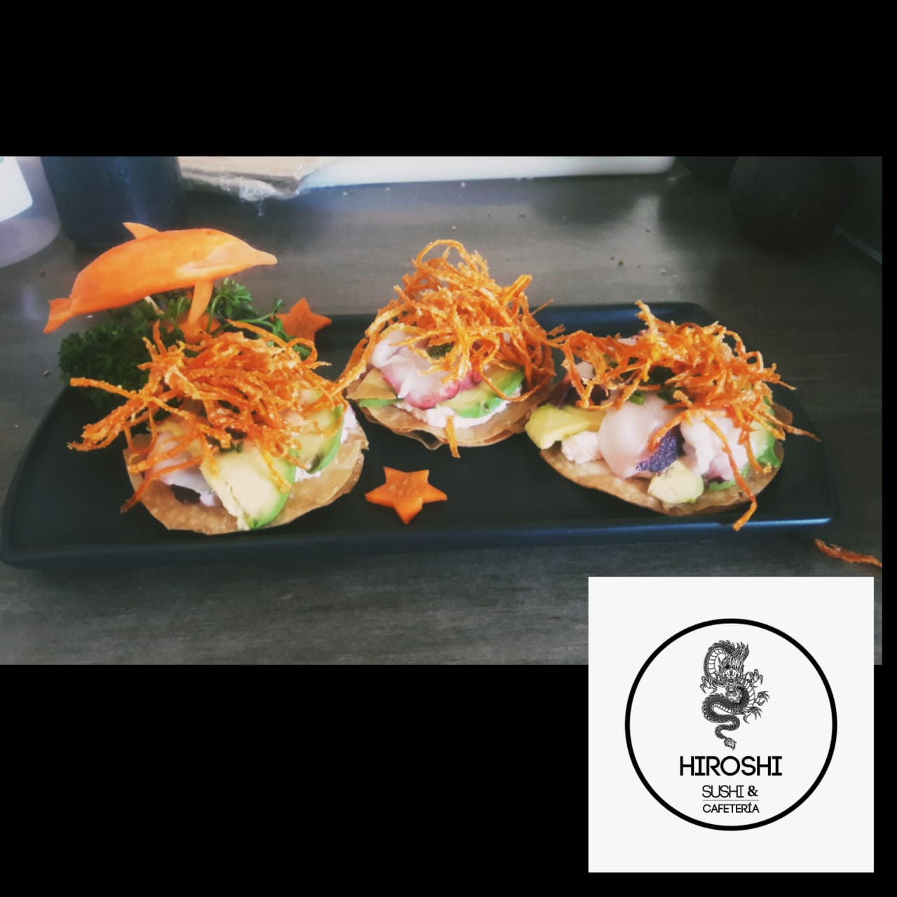Frescos tiras de atún sobre tortilla harumaki, con aguacate, salsa tampico, salsa chipotle, cebollín y kakiage, orden de 3 piezas.