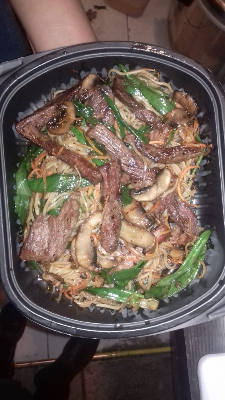 Pasta de arroz japonesa asada, con cebollín, champiñón, zanahoria y filete, sazonada con mantequilla y salsa a elegir.