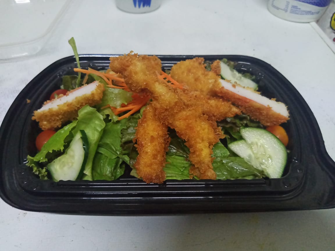 Ensalada de verduras, 2 kushiage plátano con queso, yakimeshi, rollo dragón roll y agua de sabor.