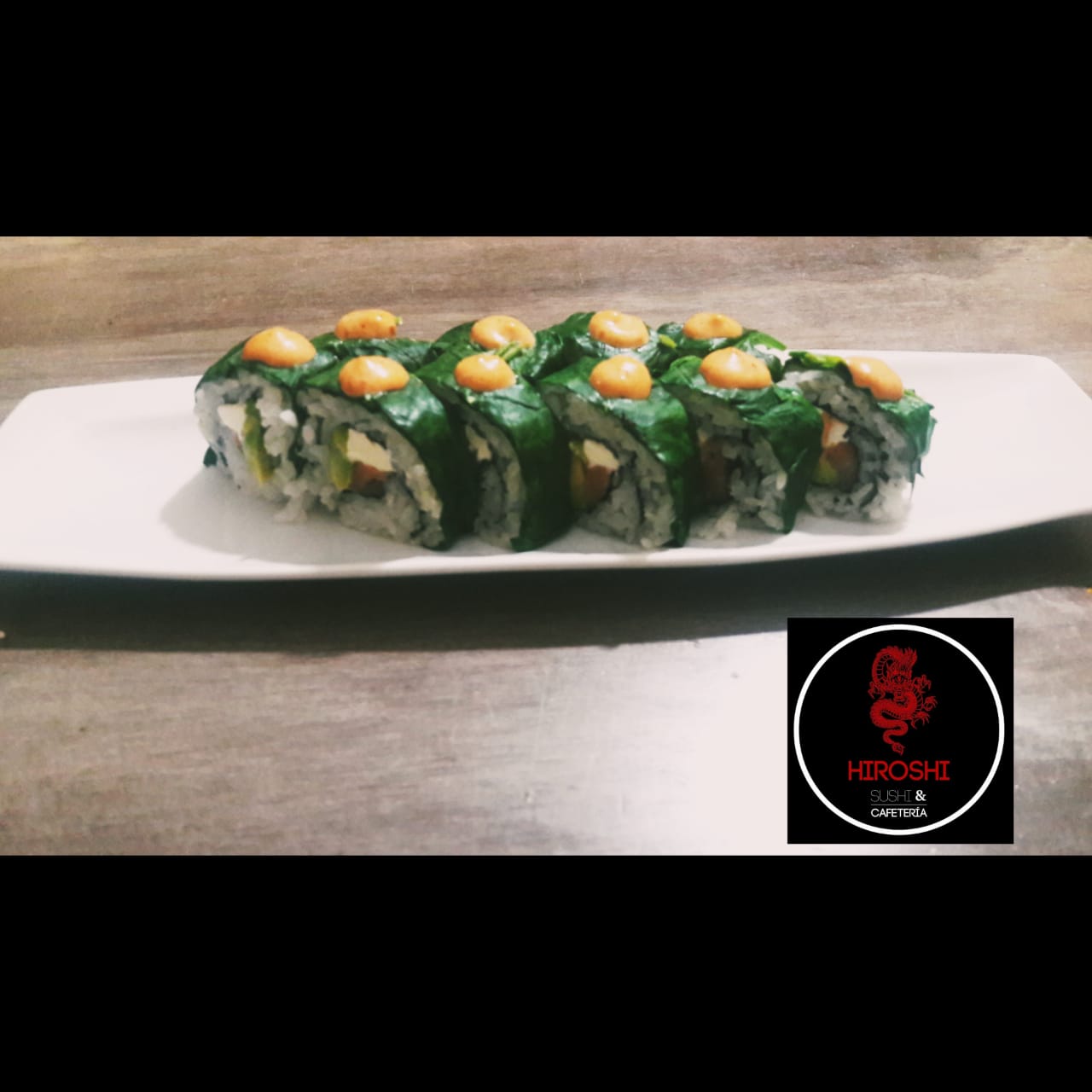 Por dentro: salmón, aguacate y queso. Por fuera: espinaca al vapor con salsa chipotle.