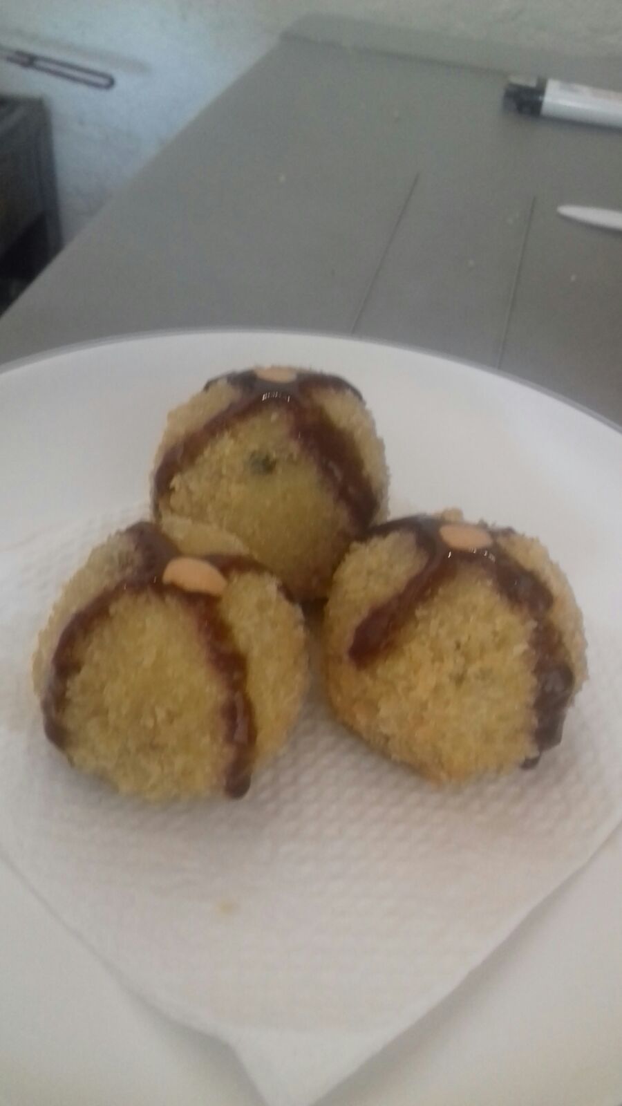 3 Bolas de arroz mezclado con cebollín, camarón, queso filadelfia, chiles toreados, perlas de arroz por fuera, servidas con salsa kushiage y chipotle.