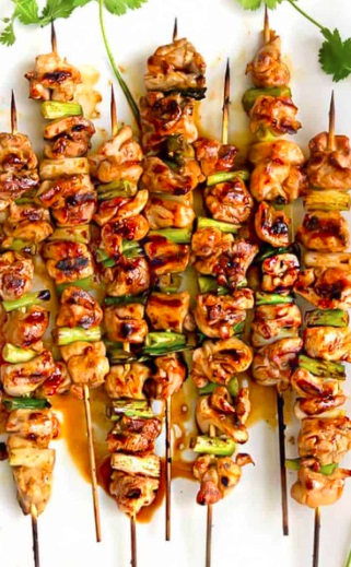 Brochetas asada de pollo, res y camarón con verduras, servidas con salsa yakitori y un toque de sishimi.
